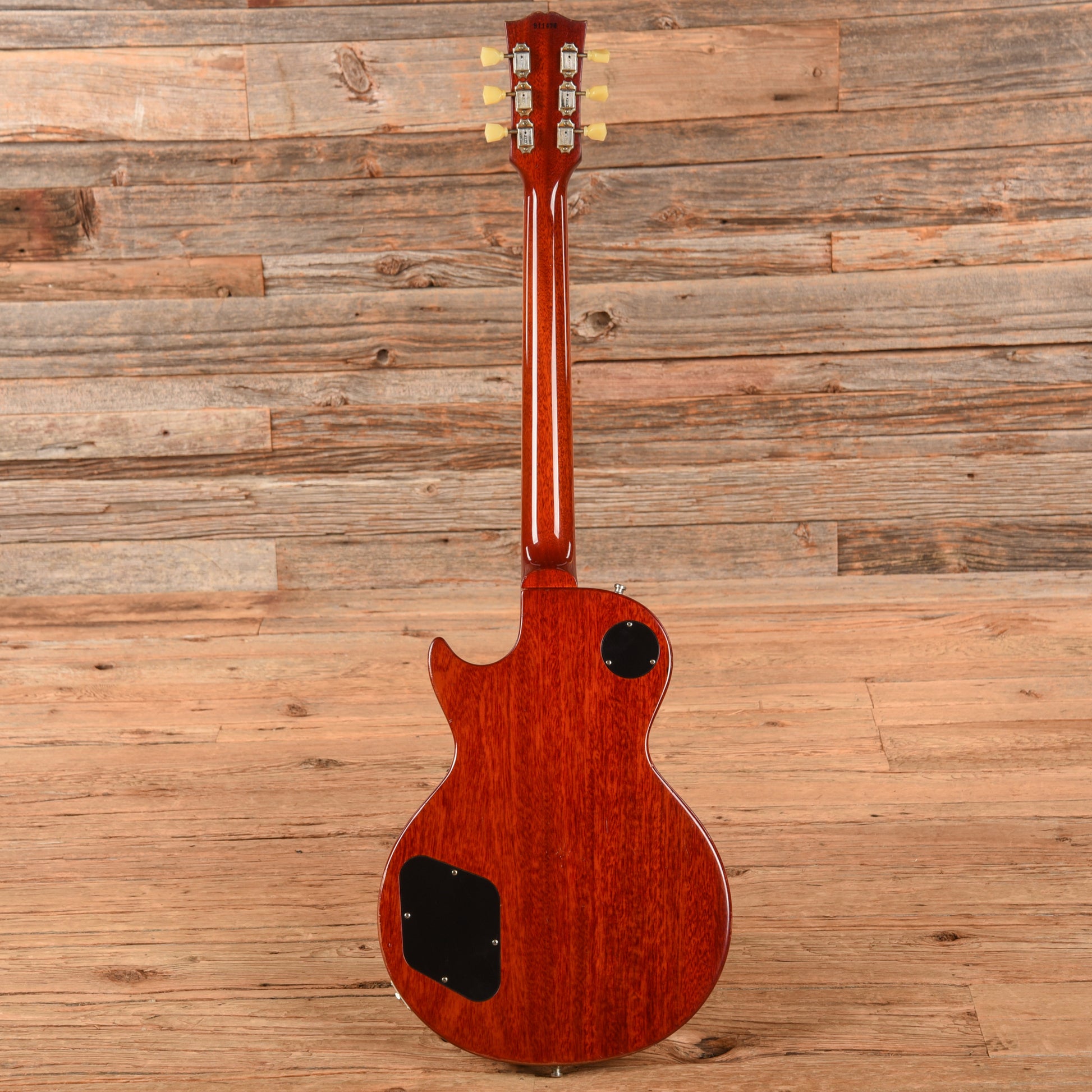 | Modifications/Repairs: | This guitar has recieved the Historic Makeovers Standard Package. According to their website: "We contour the top to vintage specs. The neck is carved to the correct vintage “C” shape and the fingerboard binding edge is rolled. We then completely refinish the guitar using our aniline dyes and unplasticized nitro-cellulose lacquer in one our vintage correct finishes. The package includes a Vintage Patina (weather-checking and aging optional). We also re-stamp the serial number in a correct 50’s typeface." In addition, Throbak humbucking pickups have been installed. Locking strap buttons have been installed. |