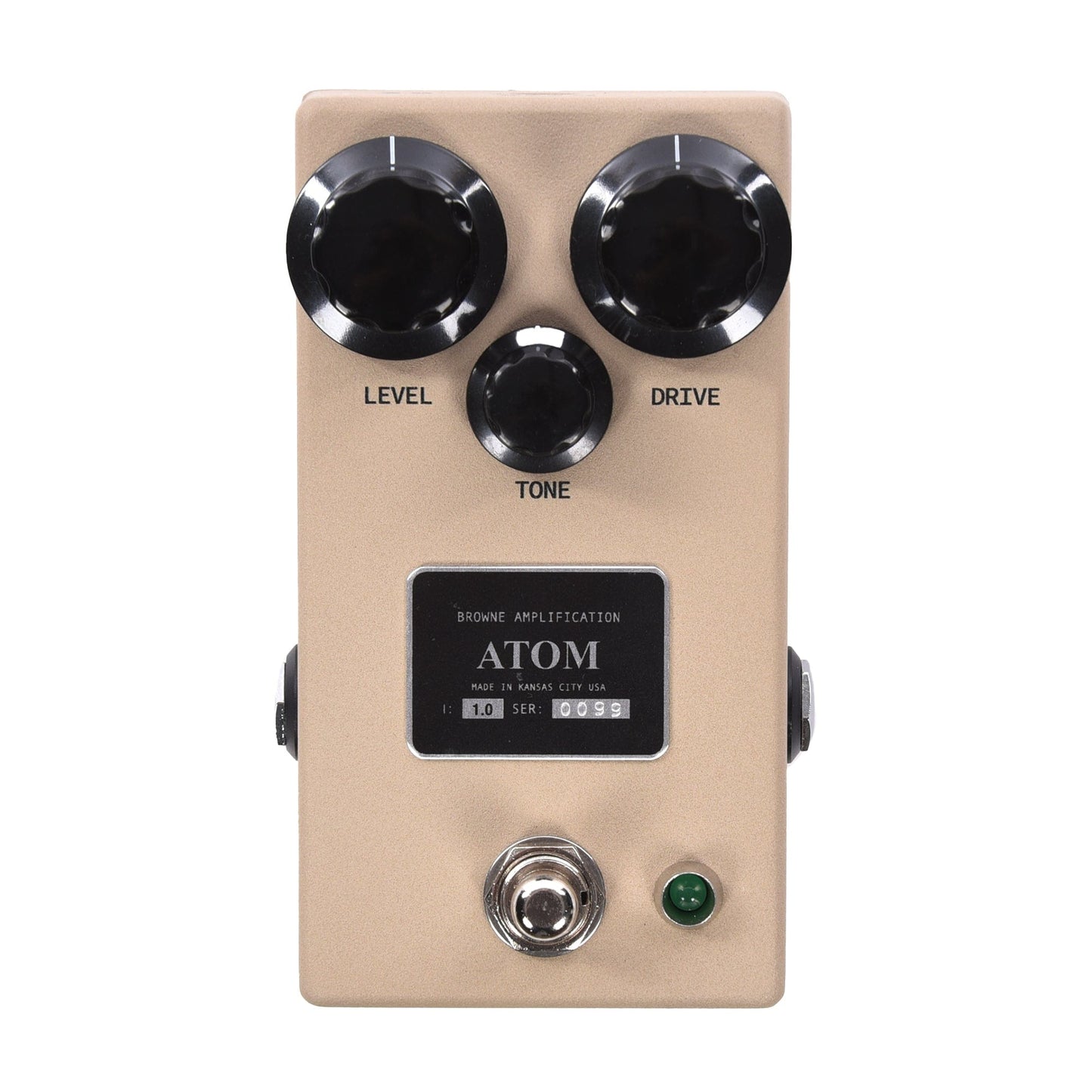 The dimensions of the ATOM are 4.8” x 2.64” x 1.6” (2.25” with knobs) and is powered by a 9V power supply with draw of 11mA. It has soft switching with an adjustable startup state and a beautiful matte powder coat called Flat Dark Earth, keeping the ATOM in the militaristic aesthetic loved by fans of Browne Amplification.