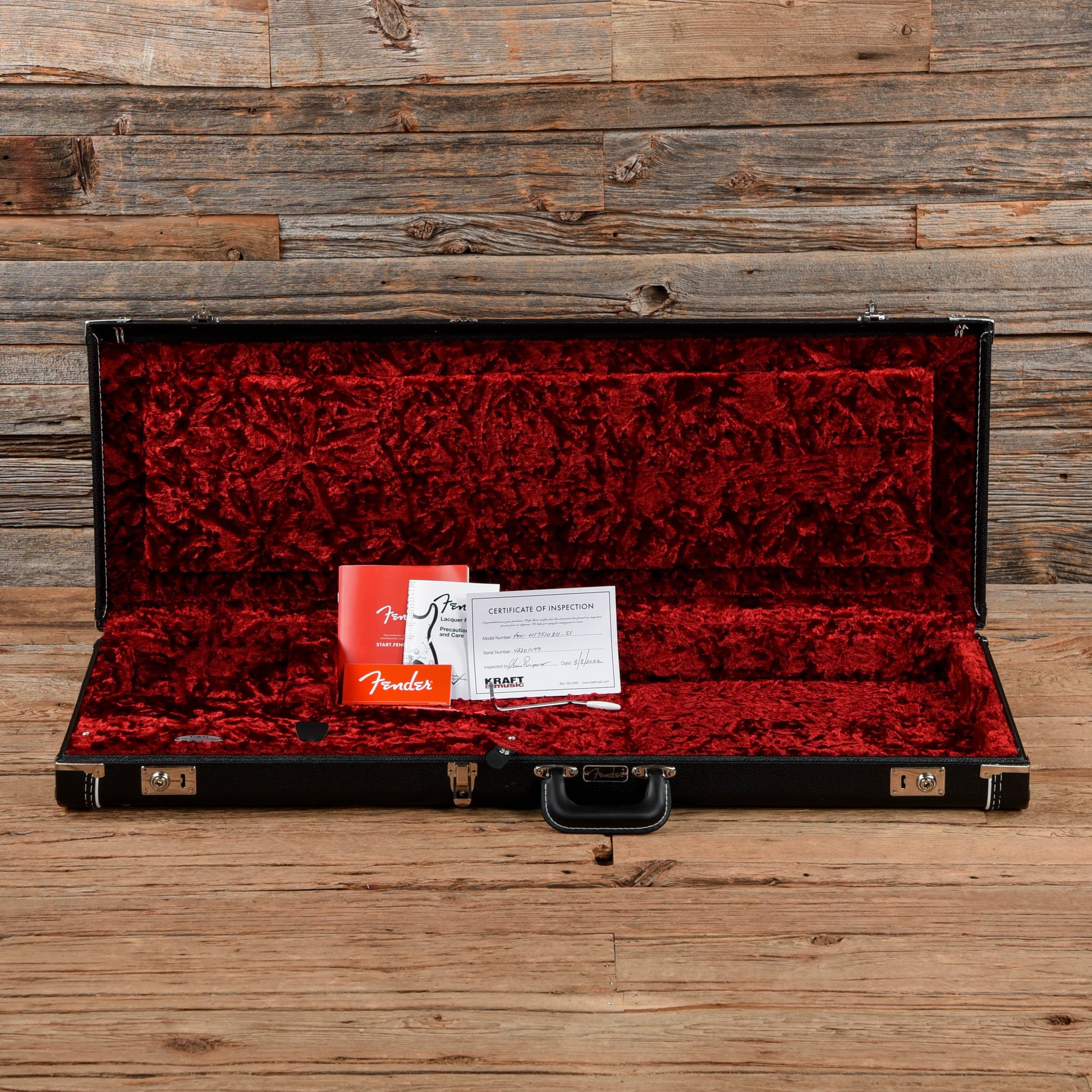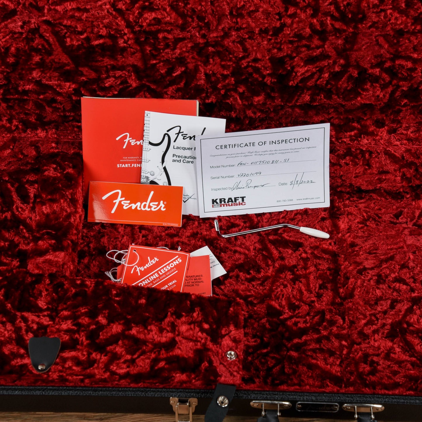 | Hardware: | Original Fender tuners, nut, bridge, and saddles. Trem arm is included in the case. |