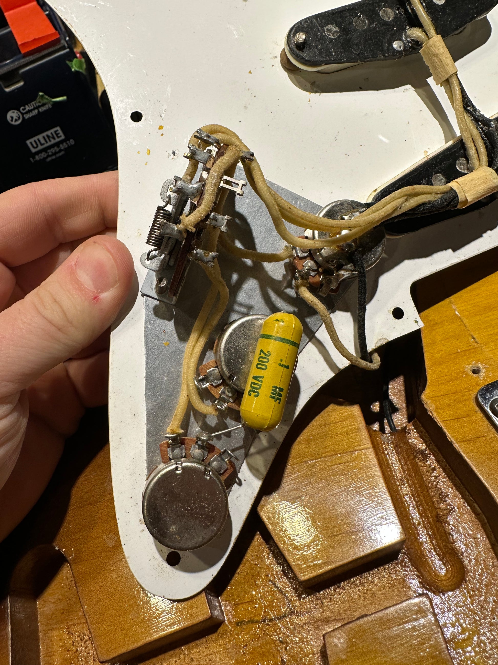 | Hardware: | Original tuners, nut, bridge, saddles, pickguard, and knobs. The original trem arm is included with the guitar. |