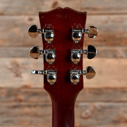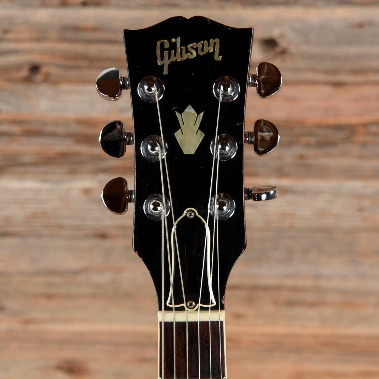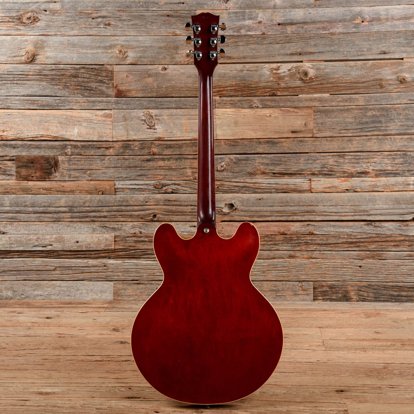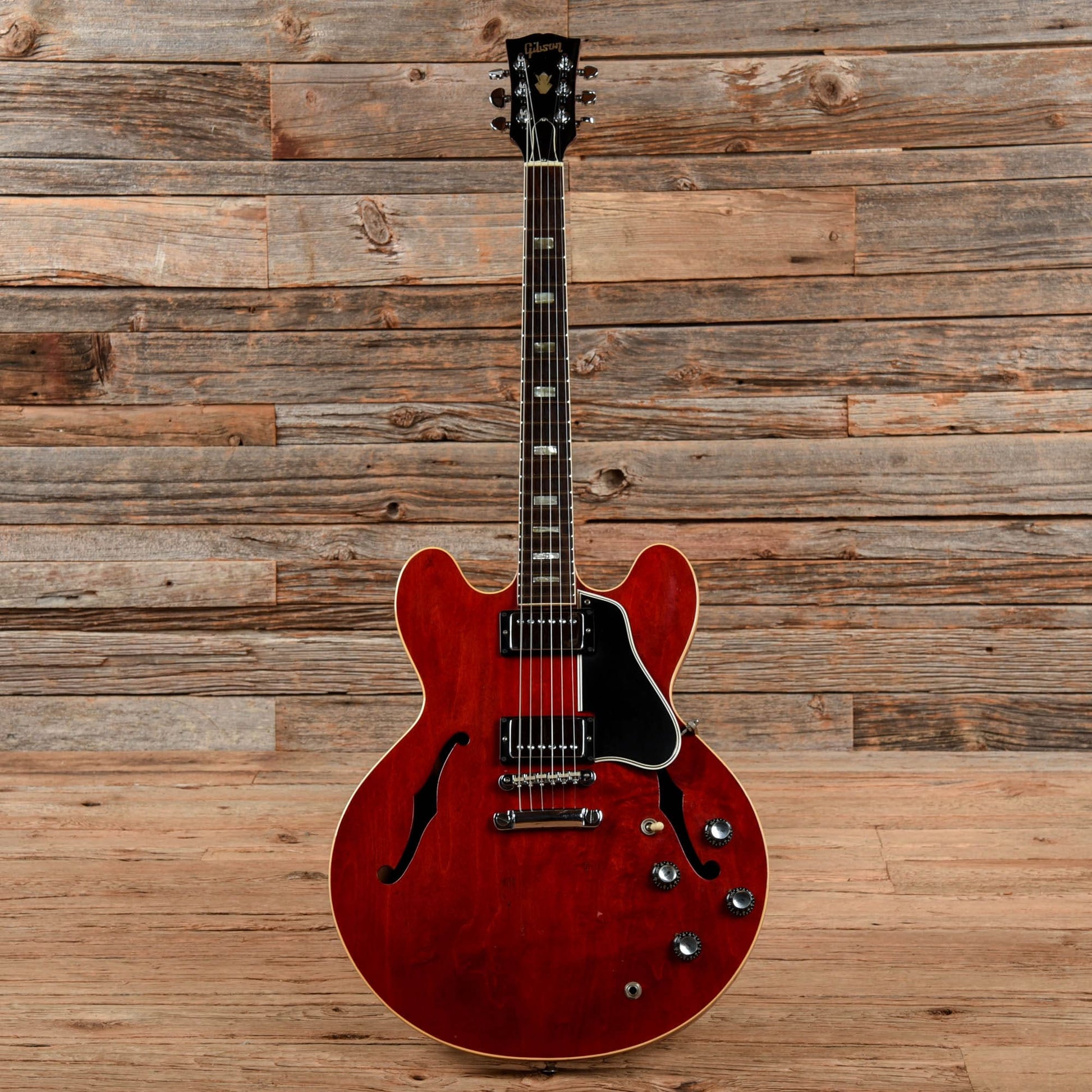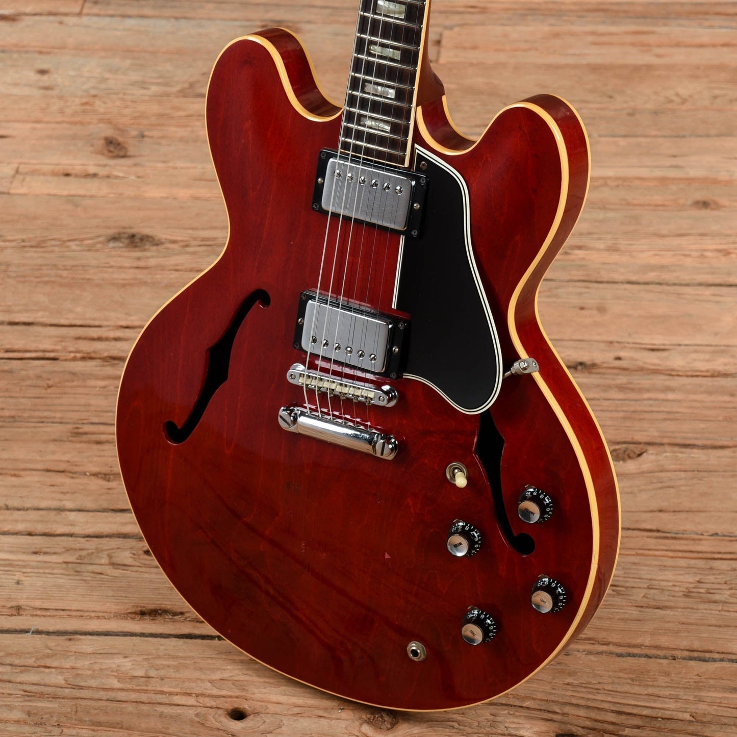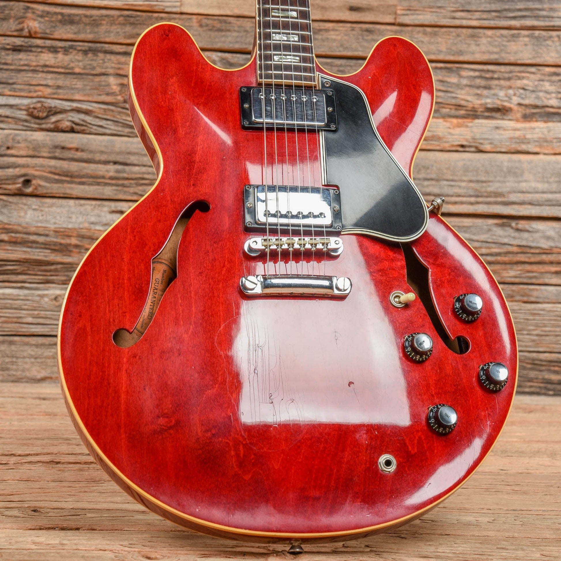 | Modifications/Repairs: | Originally a 1963 ES-335, the guitar was re-necked by Gibson in 1968, and all of the electronics and hardware were replaced with parts from 1968 at that point. The guitar was re-serialized with a 1968 serial number when serviced at Gibson. The bridge pickup lead has been replaced. Small finish touch ups are present over plugged holes in the body. There are a few plugged holes in the top and around the bottom strap button from a previously installed Bigsby. The neck has been refretted and the nut has been replaced. The tuner post holes have been modified to fit the current tuners. The tuners have been replaced with vintage Grovers, and a modern truss rod cover has been installed. |