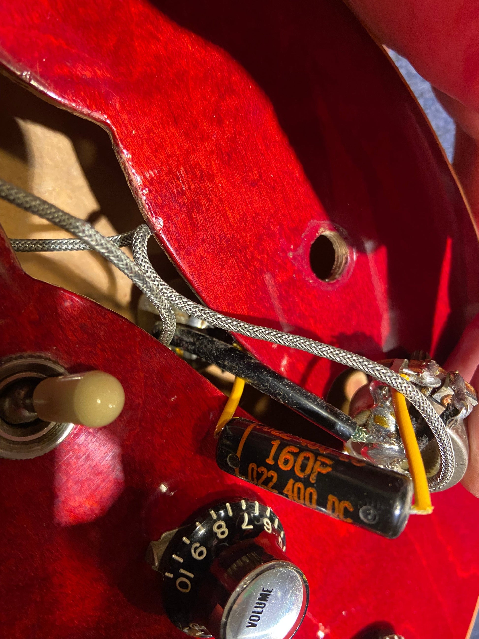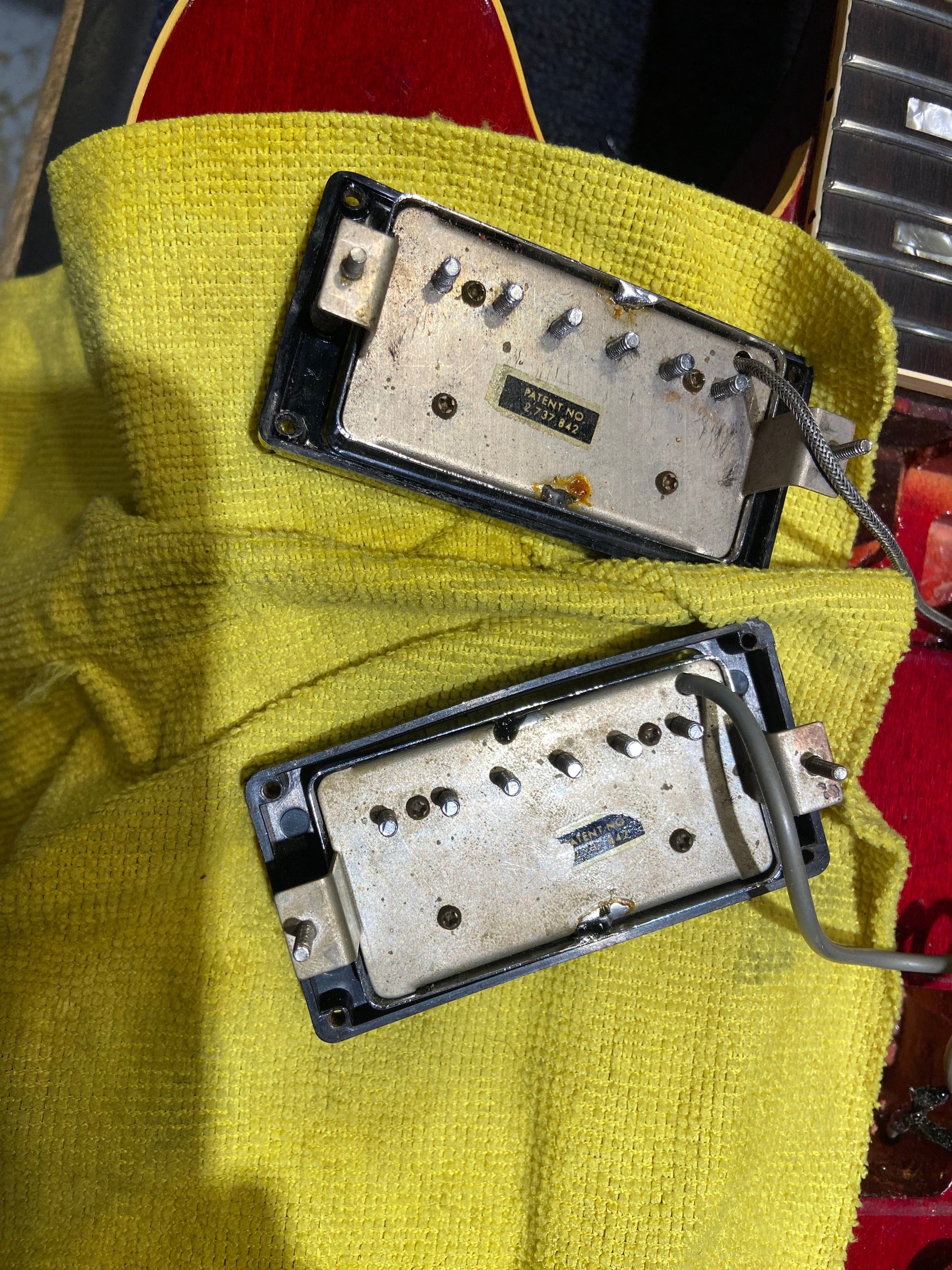 | Electronics: | 1968 wiring harness and patent sticker pickups. The controls consist of a three-position selector switch with volume and tone controls for each pickup. One visible pot code dates to 1968. The electronics were added to the guitar in 1968 when it was sent back to Gibson. The bridge pickup lead has been replaced. |