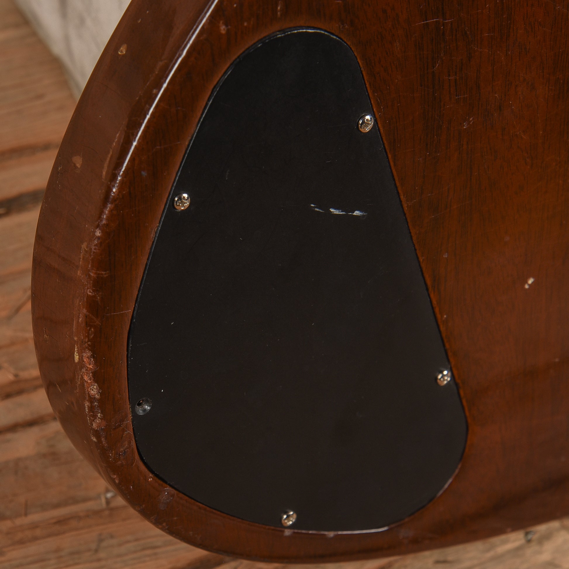 | Cosmetic Condition: | This vintage SG is in good cosmetic condition with heavy play wear. There are three-small holes in the top from previous electronic modifications. The finish has heavy checking throughout. There are holes on the top from where the Maestro vibrola was located that have been plugged and finished over. |