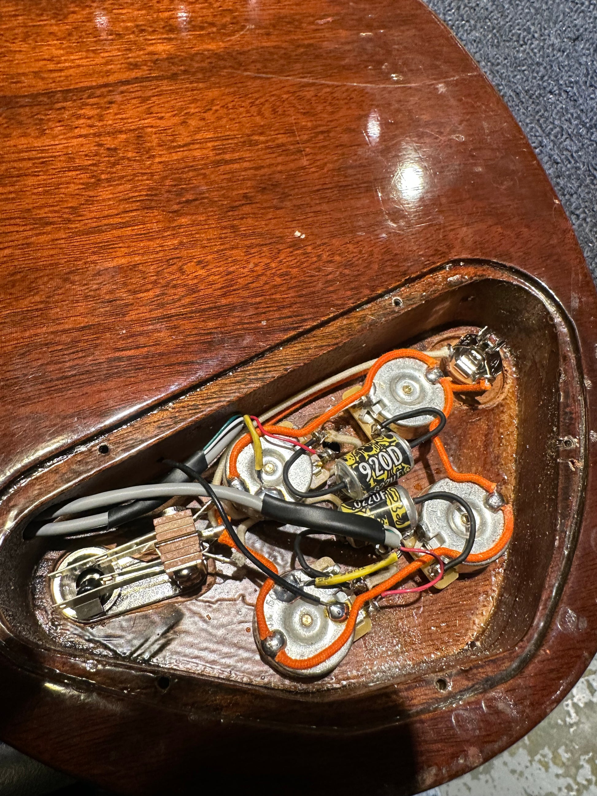 | Electronics: | Non-original modern Gibson USA humbuckers with two volume pots, two tone pots, and a three-position switch, The pots, wiring, caps, and all components are not original. |