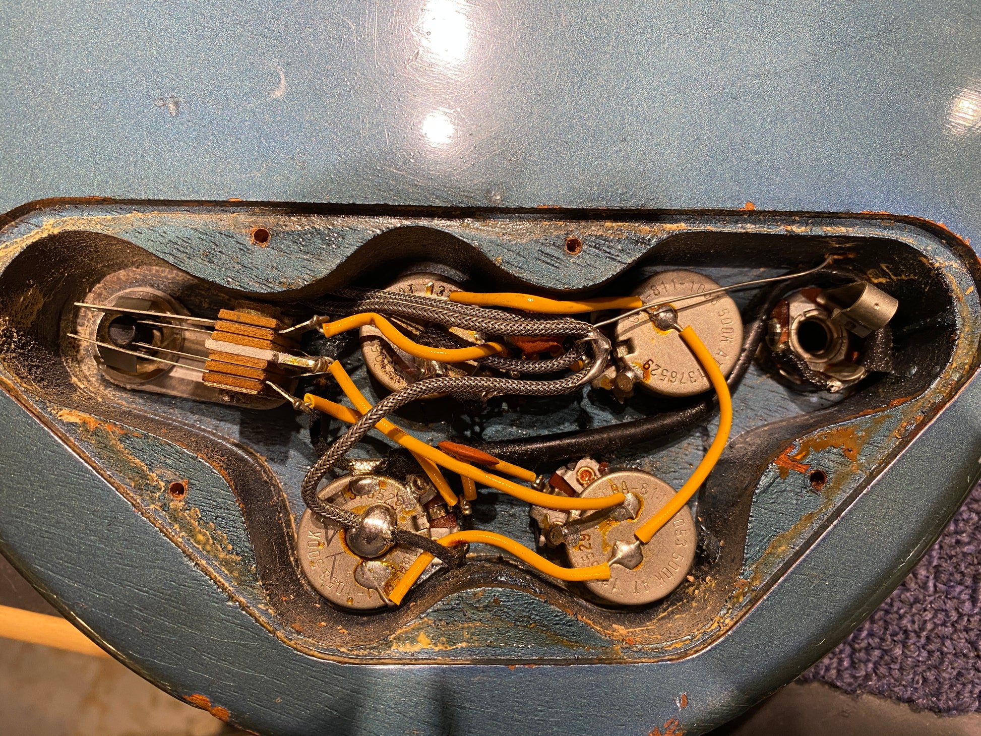 | Electronics: | Original electronics. The guitar has two patent number sticker humbuckers, a three-way selector switch, two volume pots, and two tone pots. The pot codes date to 1965. |