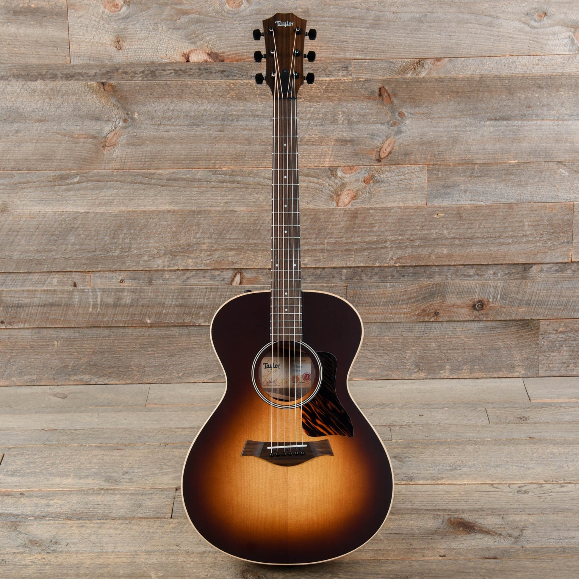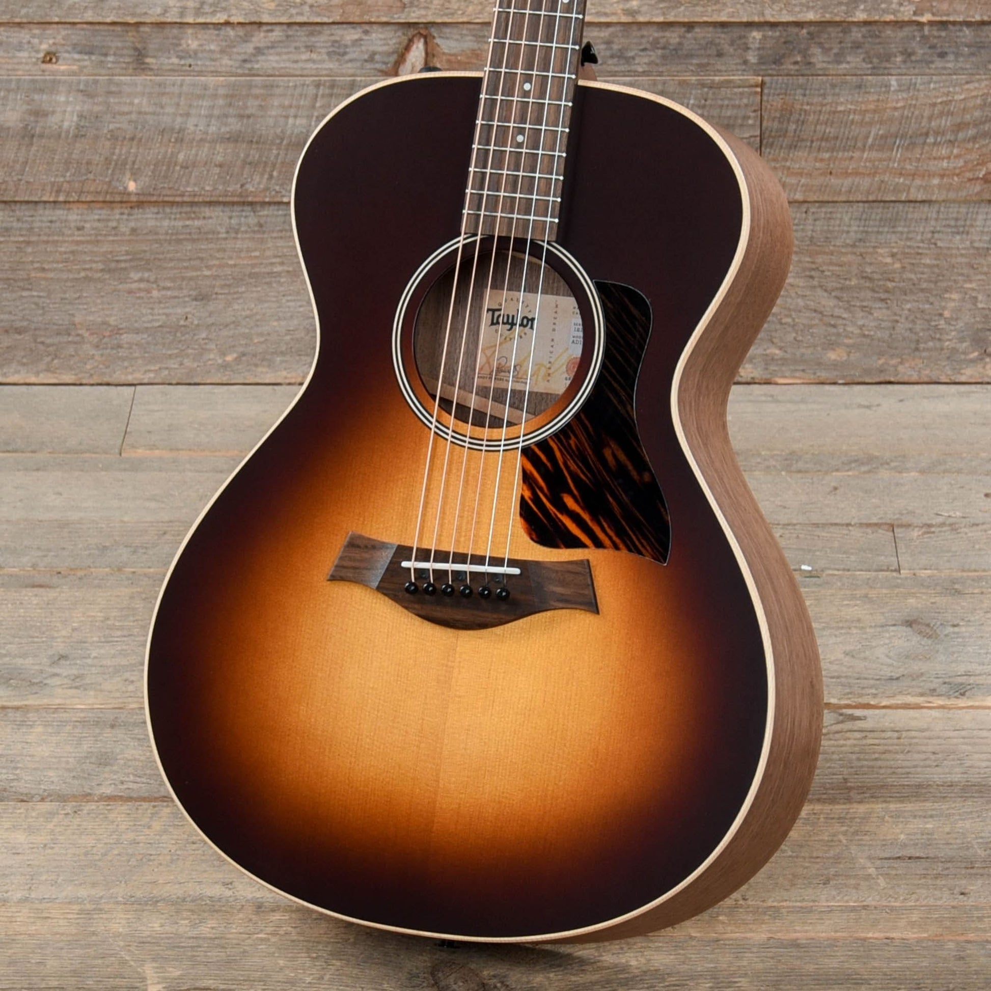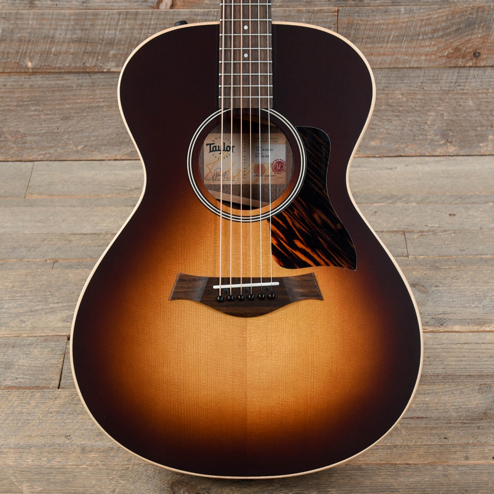 The AD12e-SB continues the American Dream Series tradition of high-performance, U.S.-made, all-solid-wood guitars that match great tone with an accessible price. This compact Grand Concert fits the bill with walnut back and sides, a spruce top and V-Class interior bracing, adding up to a warm, woody sound with bold volume, blooming sustain and a low-end response that will grow richer over time as the wood matures. Ideal for fingerstyle players as well as anyone interested in recording applications, this model matches its punchy sound with a comfortable feel thanks to accommodating dimensions and the slender Taylor Neck profile. Sparingly appointed to preserve its affordable price point, the AD12-e SB introduces a striking Tobacco Sunburst top color treatment to the American Dream family, accented with a thin matte finish, a firestripe faux tortoiseshell pickguard, black top purfling and satin black tuners. It ships with ES2 electronics and a lightweight, durable AeroCase.