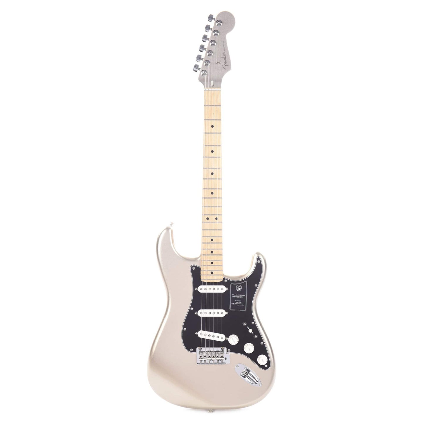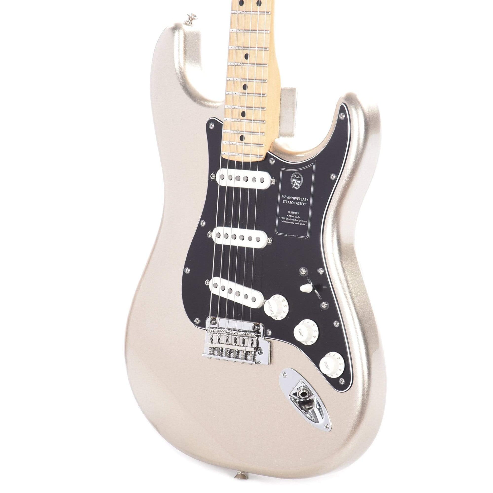 The 75th Anniversary Stratocaster is finished in a striking Diamond Anniversary finish with a matching painted headstock. The maple neck features a "Modern C" profile, medium jumbo frets and a satin finish for supreme comfort and playability. Vinage-style ‘60s pickups provide sweet Strat tone, while a 2-point tremolo delivers smooth vibrato and improved tuning stability. Every Anniversary Stratocaster features a special 75th anniversary neck plate and ships in a deluxe gig bag.