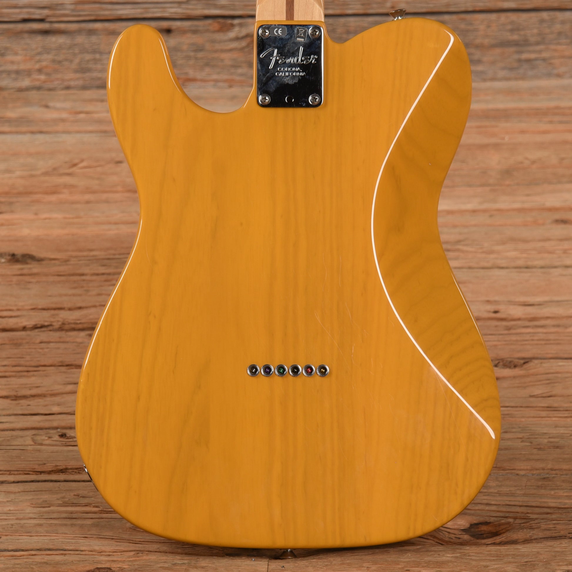 | Tech Notes: | This Telecaster plays well with low action. The frets are tall and show light wear. There is a dent and a large chip in the finish on the treble side lower bout near the output jack (see pics). |