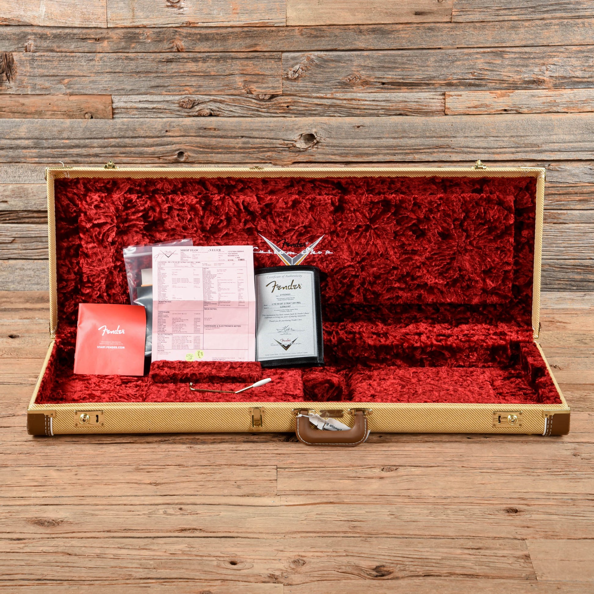 | Tech Notes: | This Stratocaster plays well with low action and optimal neck relief. The frets are tall and show light play wear. |