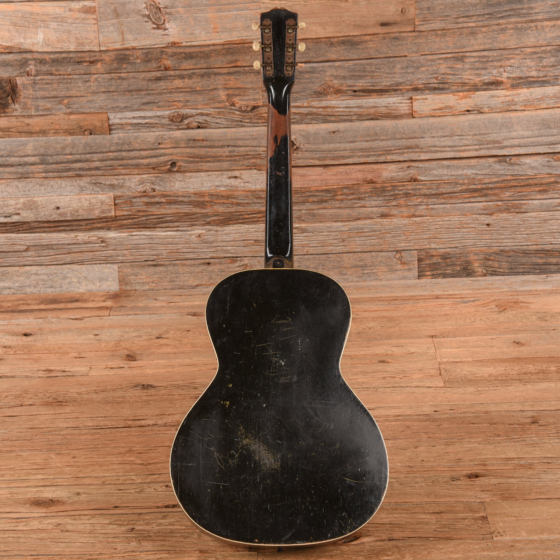 Tech Notes: This guitar plays well with medium-low action. The frets are tall with light play wear. Because the guitar has binding on the back of the body and is painted black, we are dating it to 1938. The black finish was discontinued in 1938. The factory order number is not fully visible.