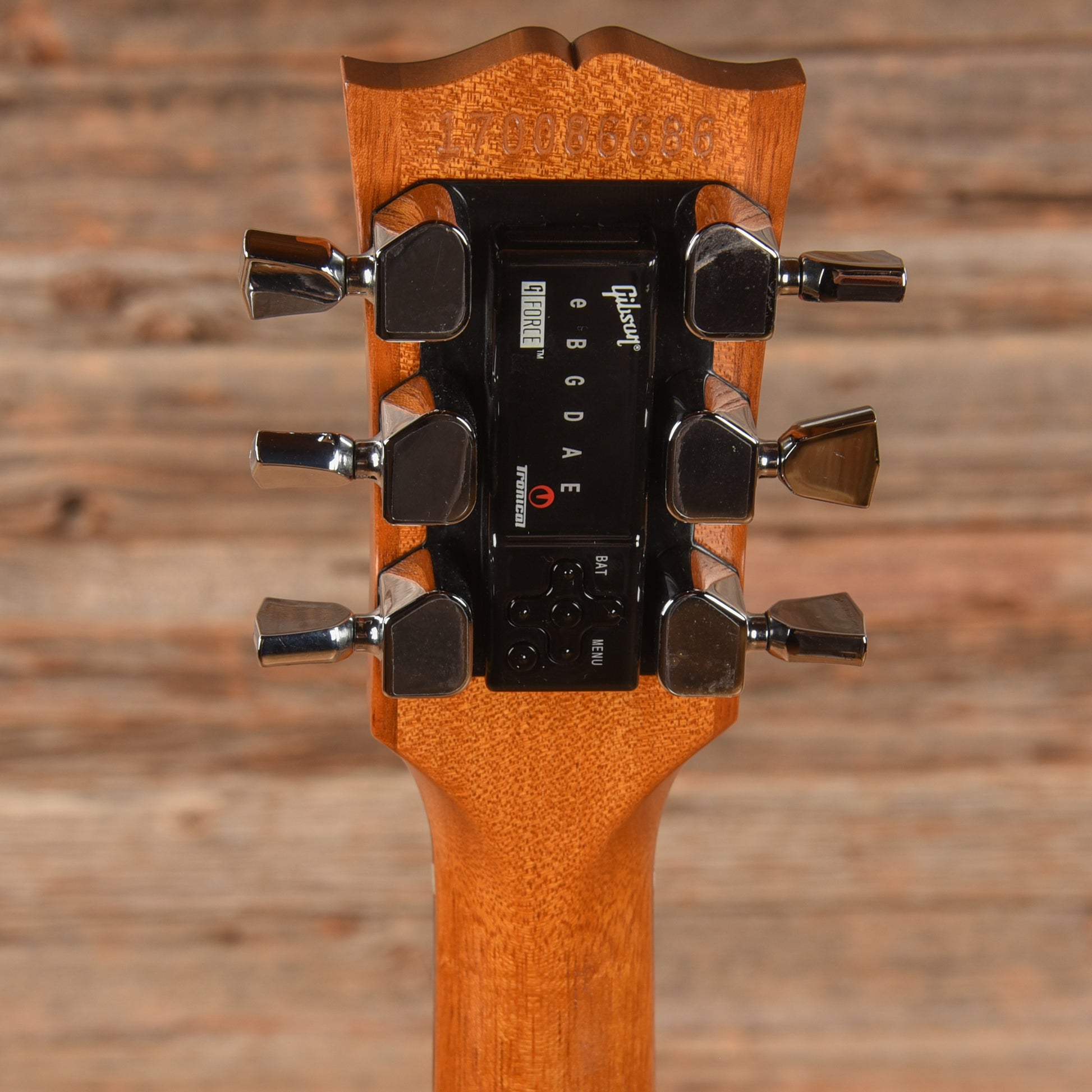 | Electronics: | Original electronics. The guitar has two humbuckers, a three-way selector switch, two volume pots, two tone pots, and a G-Force Auto Tuner set. |