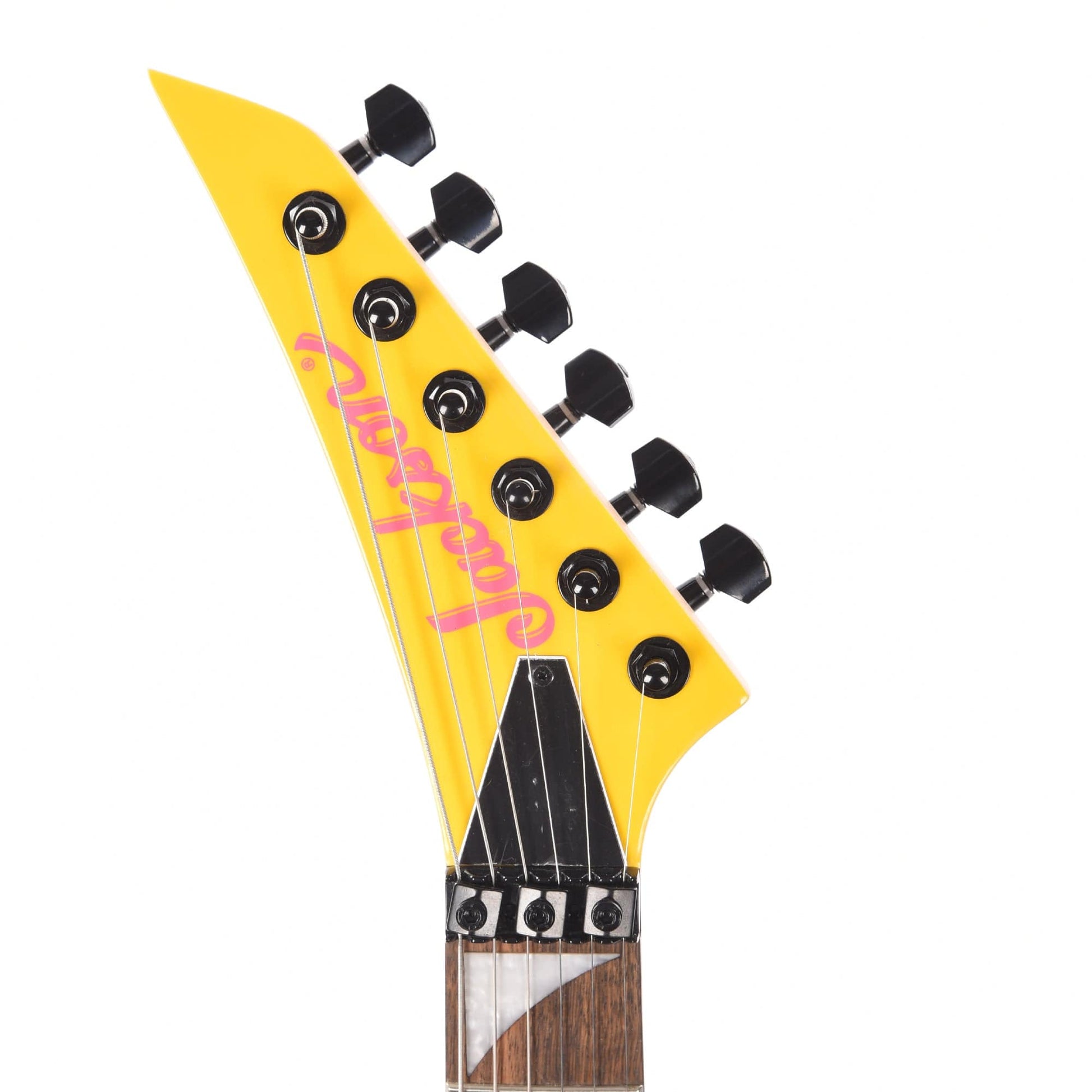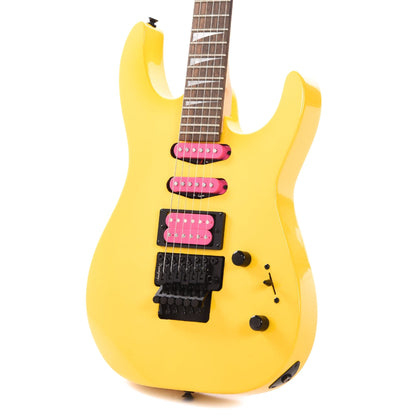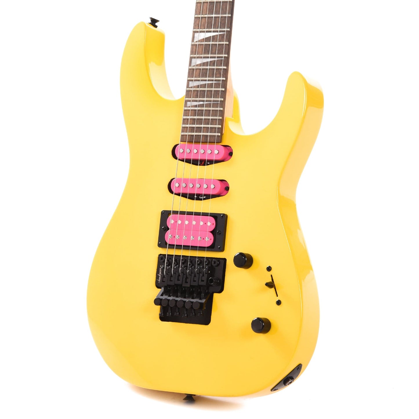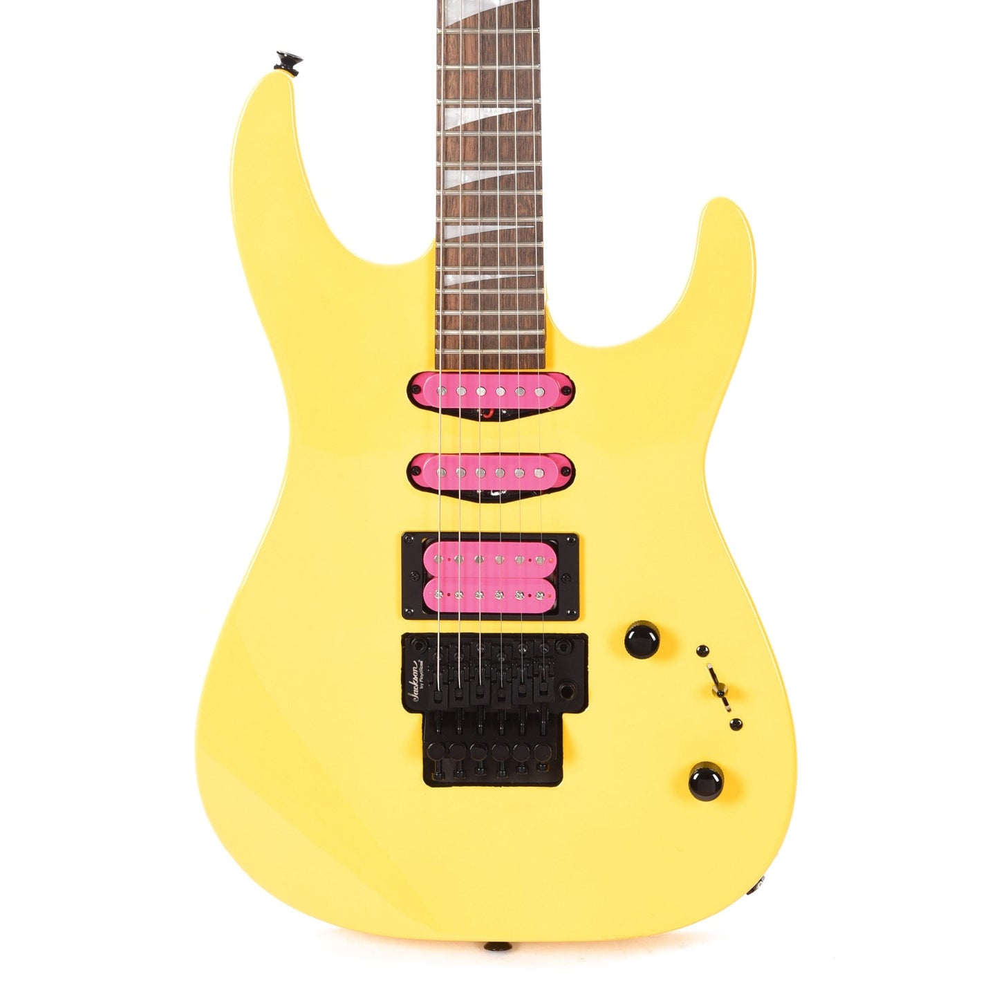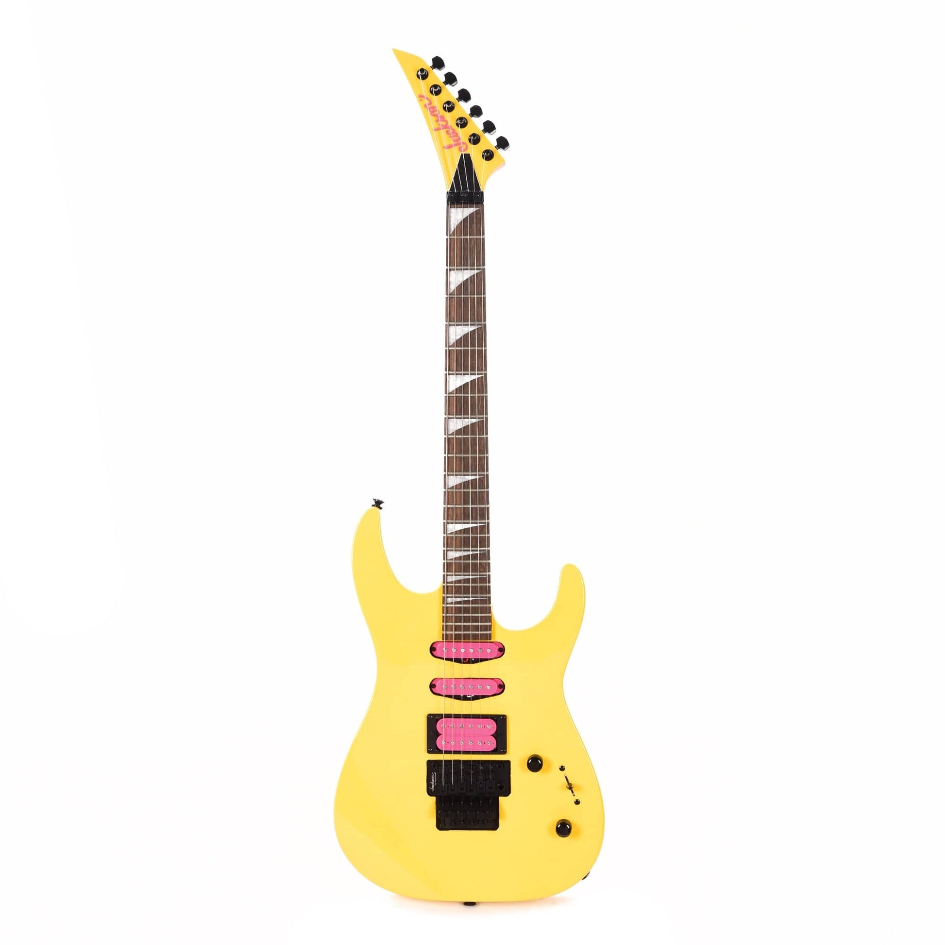 Captivating in both sound and style, the X Series Dinky DK3XR HSS is dressed in Caution Yellow or Neon Pink with a color matched reverse Jackson pointed 6-in-line headstock and black hardware. The Caution Yellow finish also features pink pickup bobbins and pink Jackson headstock logo, while the Neon Pink features pink pickup bobbins and a black Jackson headstock logo.