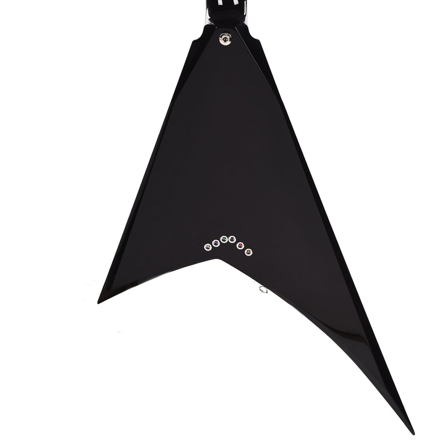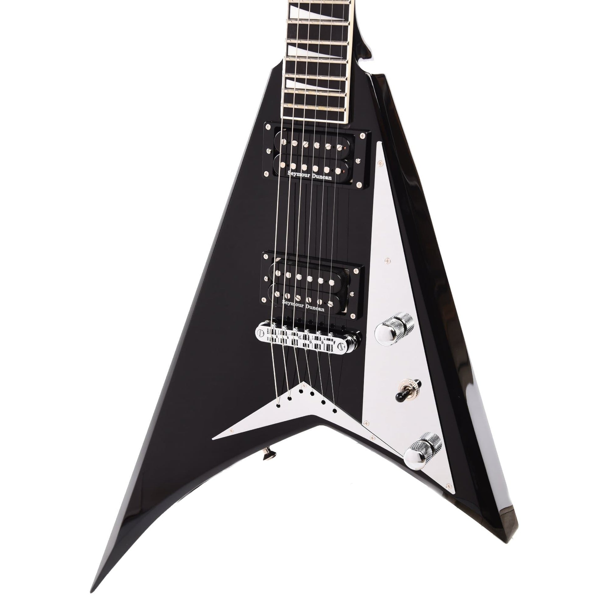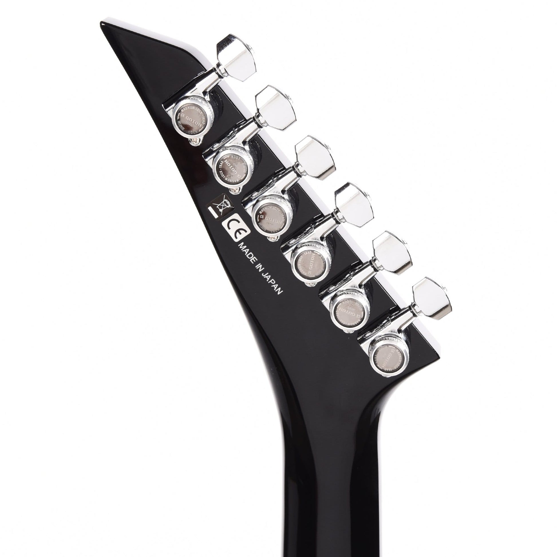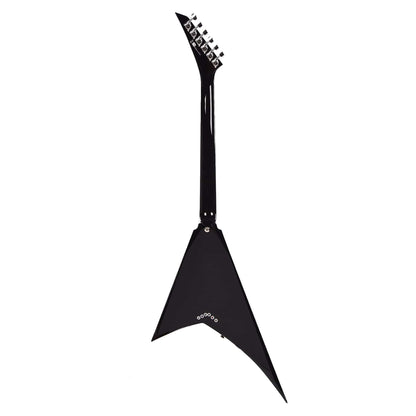 The MJ Series Rhoads RRT boasts classic metal style in a Gloss Black finish with black pointy headstock, chrome pickguard and chrome hardware.