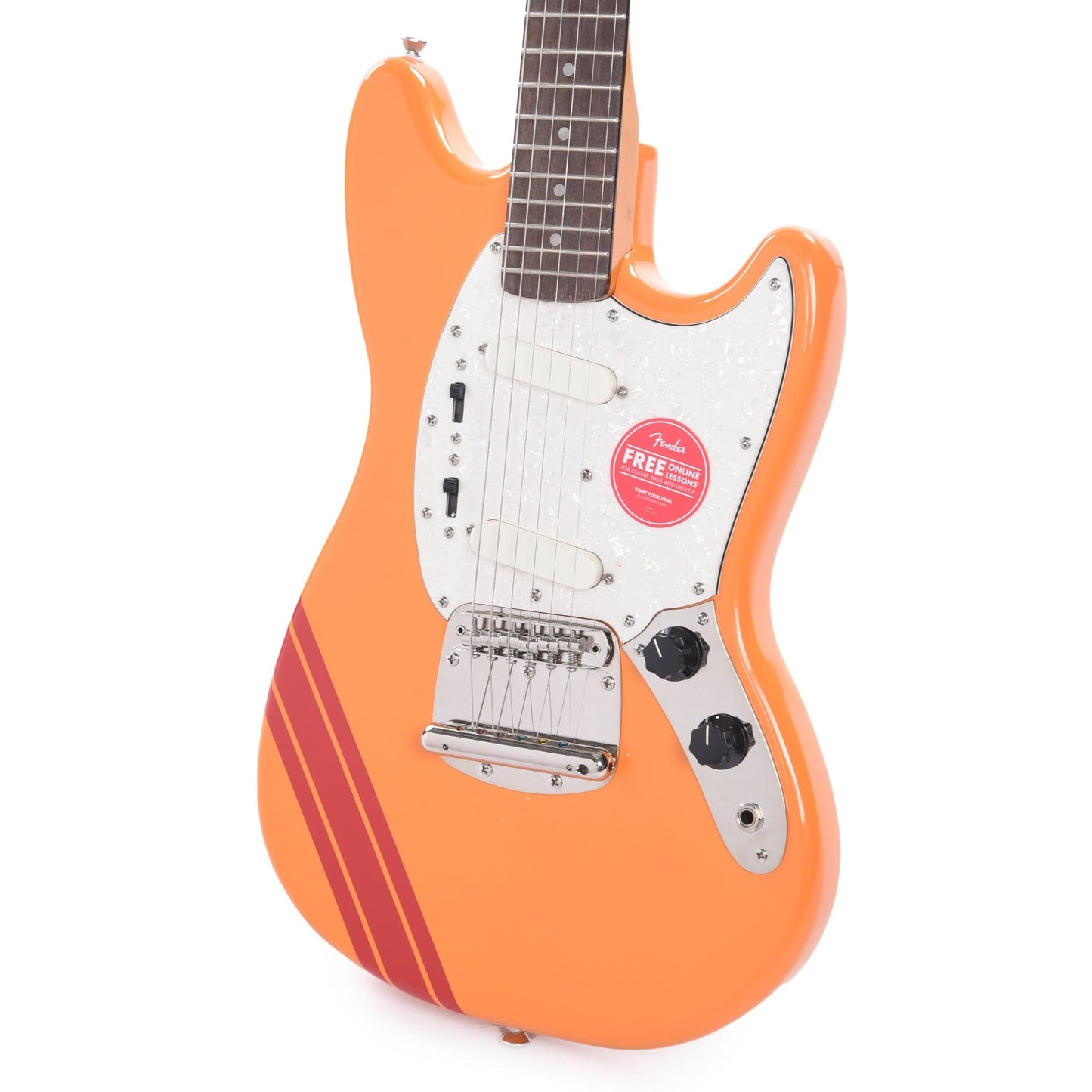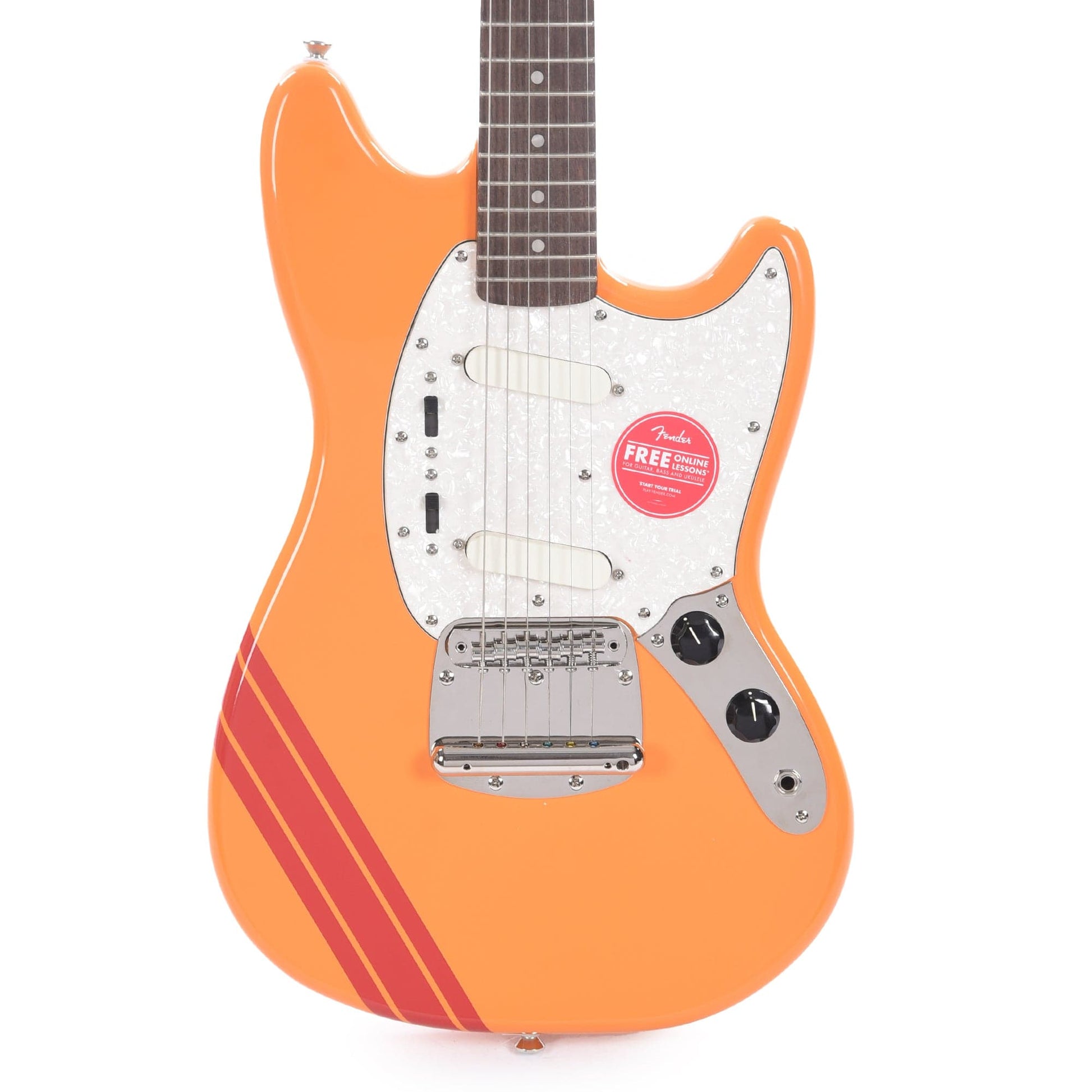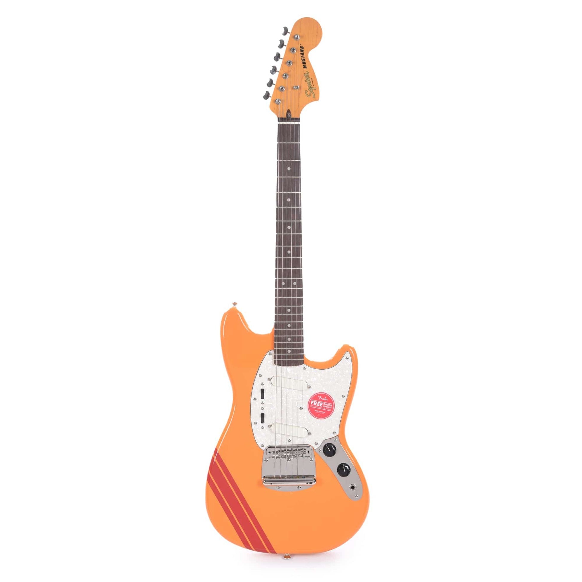 In 1969, Fender released "Competition" versions of its short-scale Mustang and Mustang Bass model, sporting a more distinctive visual flair inspired by Mustang cars of the era with an instantly recognizable, Shelby-inspired racing stripe on each of its “Competition” Mustang and Mustang Bass colorways. Now, CME has partnered with Squier to offer our customers CME Exclusive colorway replicating the rarest color among its “Competition” counterparts using the current Fender colors Capri Orange and Dakota Red!