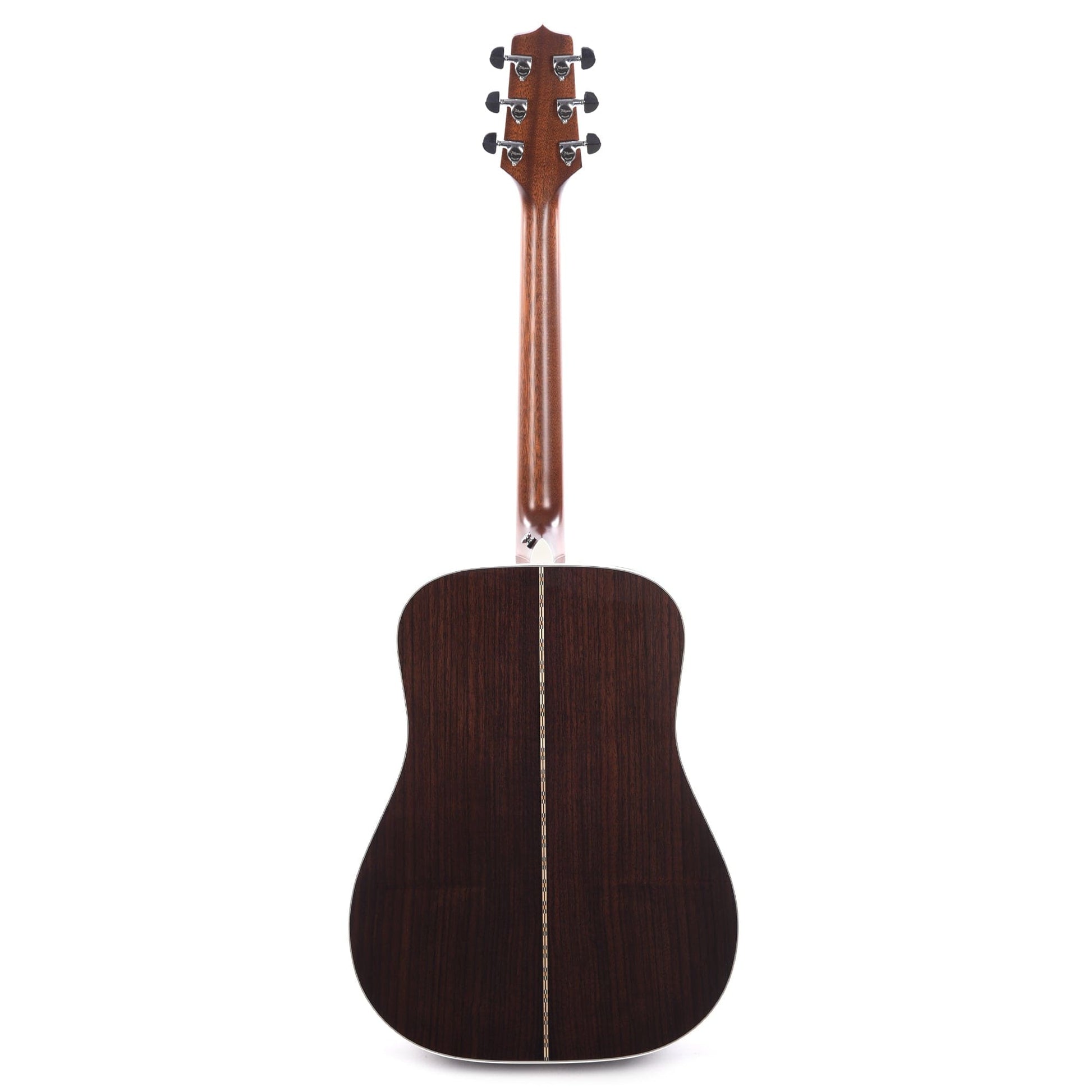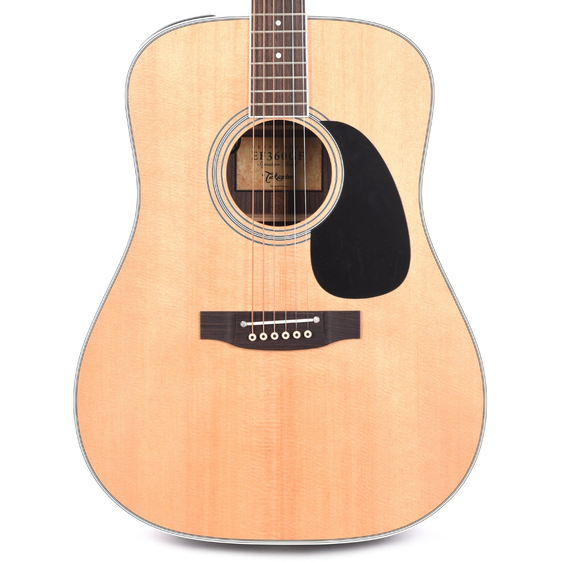 “It’s warm,” he says, “but especially for playing live it’s important to have a guitar with a distinct high end and not too many overtones in the low and mid ranges. That’s a great sound for sitting in your living room, but a live sound engineer has to squash it. For mixing live, it’s better to have a guitar that’s perfect mid-to top, because you can always add lows. That switches the posture from defensive mixing— taking something away from the guitar—to adding to it in order to fill a few things out.” Frey continued, “Some designers and engineers from Takamine took my Number One for a couple days and made extensive measurements of every part of the guitar, from the thickness of the top and exact placement of the braces, to the thickness of the finish—everything about it.” After making copious notes, they returned to the factory to make two prototypes: one exactly like the original with a laminated back, and one with a solid back. Frey decided he liked the solid back best, so that became the Glenn Frey model. Regarding the almost Spartan simplicity of the instrument, Frey said it was important to him to keep the guitar affordable as well as extremely functional. The key for him was sound and usefulness. He explained that, “the finish and inlay and bells and whistles don’t have anything to do with that. We took a pretty straightforward approach to it; the only thing it has is the little ‘GF’ on the headstock. I’ve had ten or twelve of these in my hands, and they all sounded great and needed very little set up.”