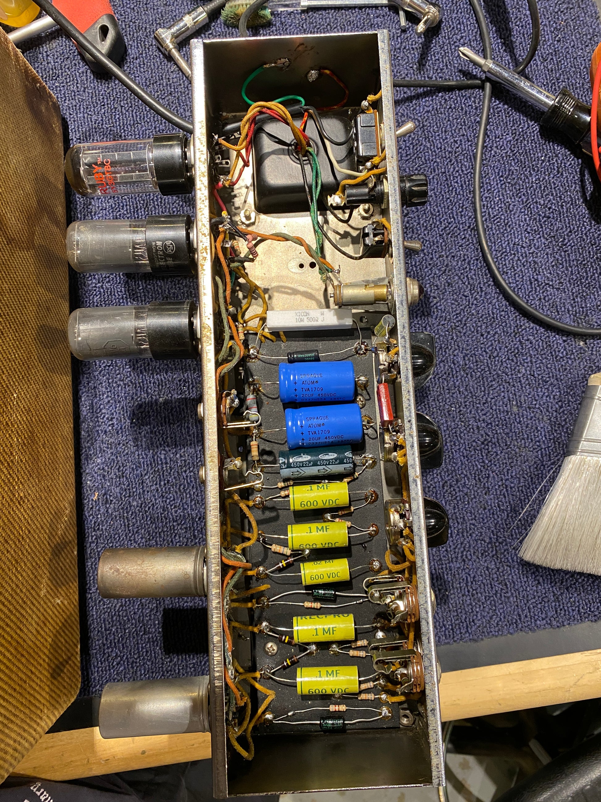 Modifications/Repairs: -The output transformer has been replaced. -The amp has been entirely recapped and most resistors have been replaced. -The speaker is era-correct, but dates to 1959. -A three-prong power cord has been installed. -The handle has been replaced.
