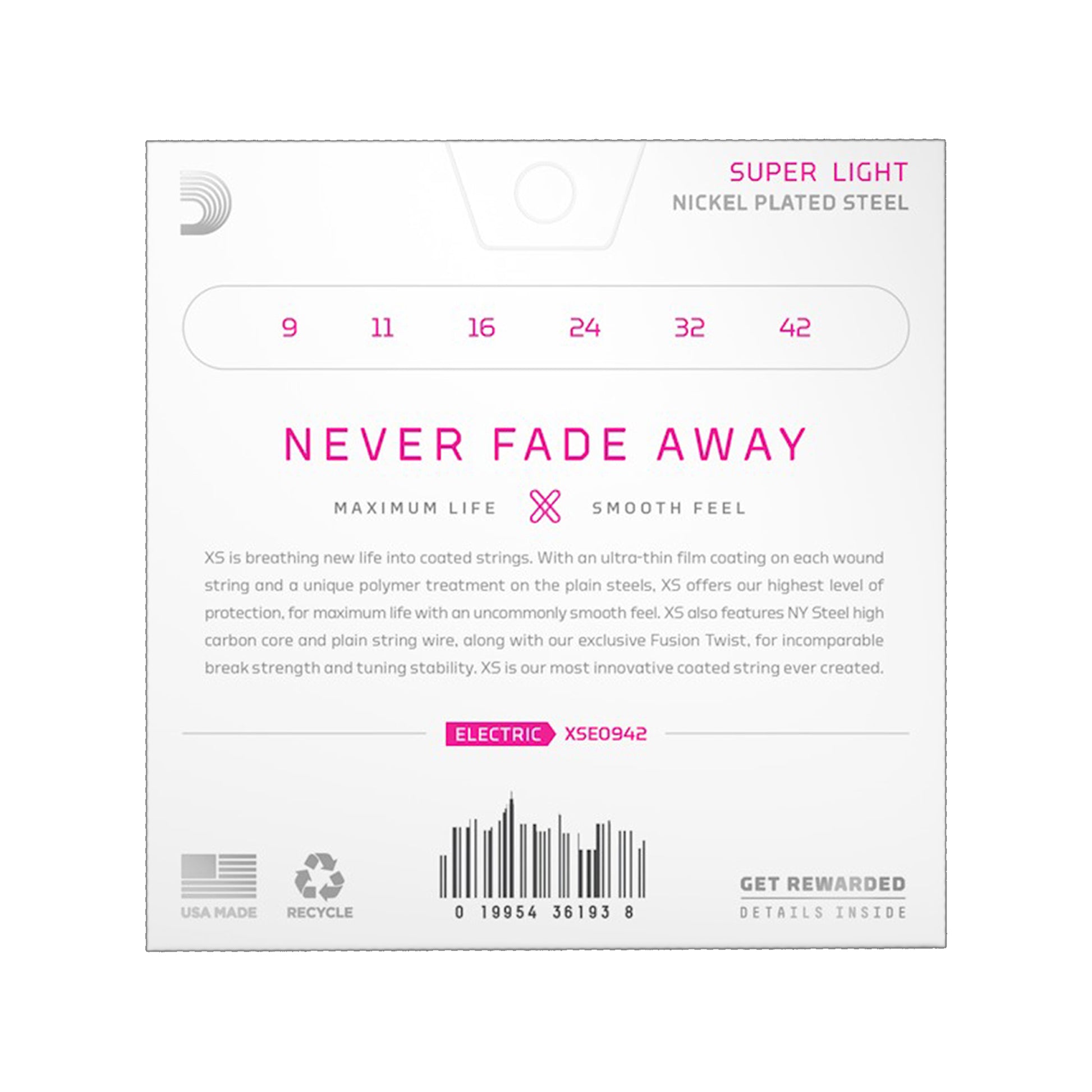 XS Nickel coated electric guitar strings provide the longest life of any D’Addario electric guitar string. Coated with our groundbreaking XS coating, these premium electric strings attain maximum life and a smooth, fast feel without dampening their outstanding tone. Constructed with a NY Steel core, reformulated nickel-plated steel wrap wire, and Fusion Twist technology, XS Nickel strings boast superior strength and tuning stability, plus richer harmonics, greater clarity, and remarkable definition with every sweep, slide, and bend. This 9-42 Super Light gauge set is easy to bend and very flexible.