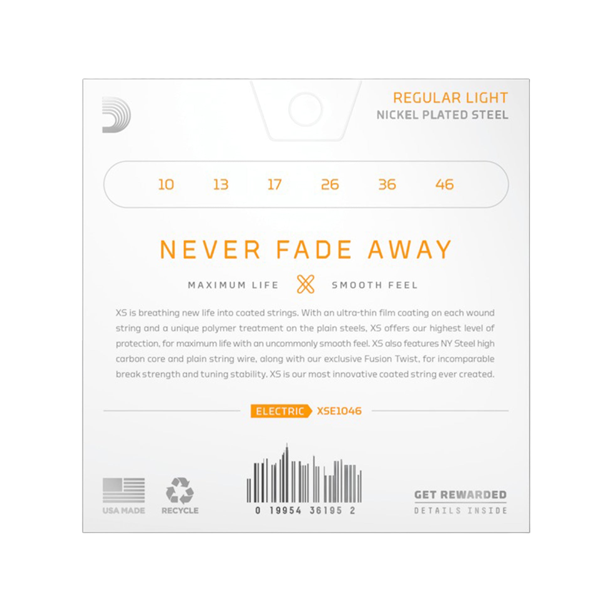XS Nickel coated electric guitar strings provide the longest life of any D’Addario electric guitar string. Coated with our groundbreaking XS coating, these premium electric strings attain maximum life and a smooth, fast feel without dampening their outstanding tone. Constructed with a NY Steel core, reformulated nickel-plated steel wrap wire, and Fusion Twist technology, XS Nickel strings boast superior strength and tuning stability, plus richer harmonics, greater clarity, and remarkable definition with every sweep, slide, and bend. This 10-46 Regular Light gauge set is our most popular gauge, providing a nice balance of tone and playability.