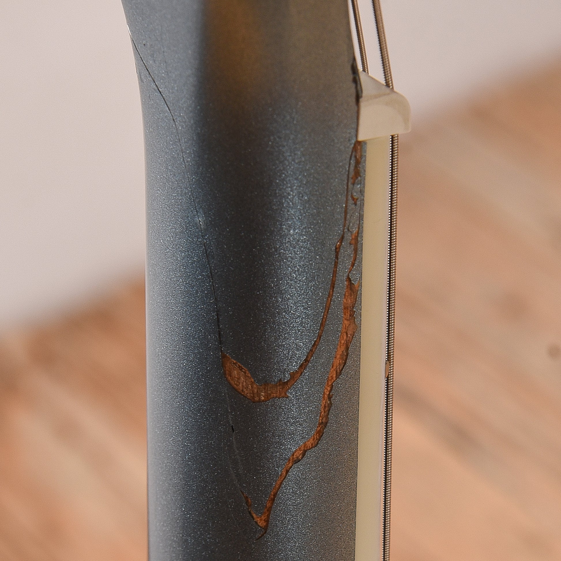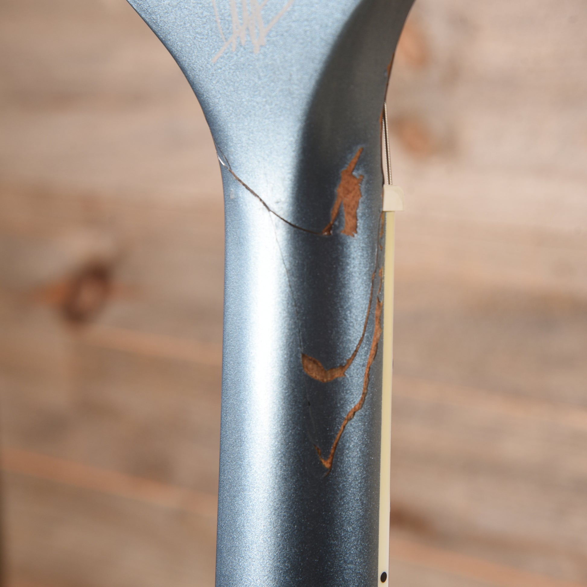 | Cosmetic Condition: | This guitar is in good condition. The headstock is heavily scratched with a visible headstock repair that has some blue finish missing in a few spots on the bass side of the neck. |