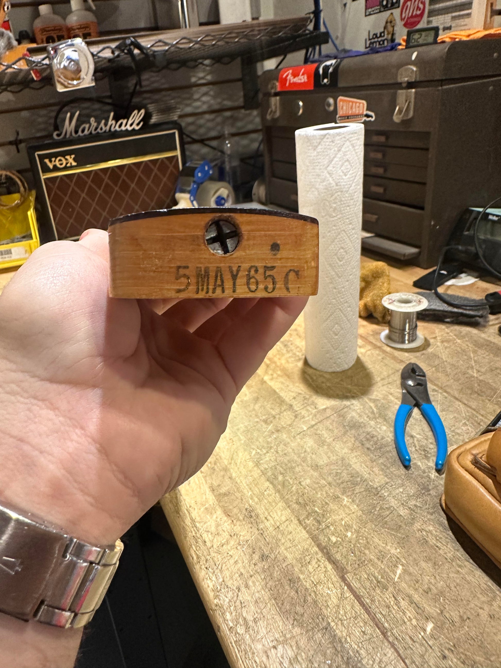 | Electronics: | Non-original volume and tone pots. The output jack is not original as well. The pickup does appear to be original with "65" written on the bobbin. |