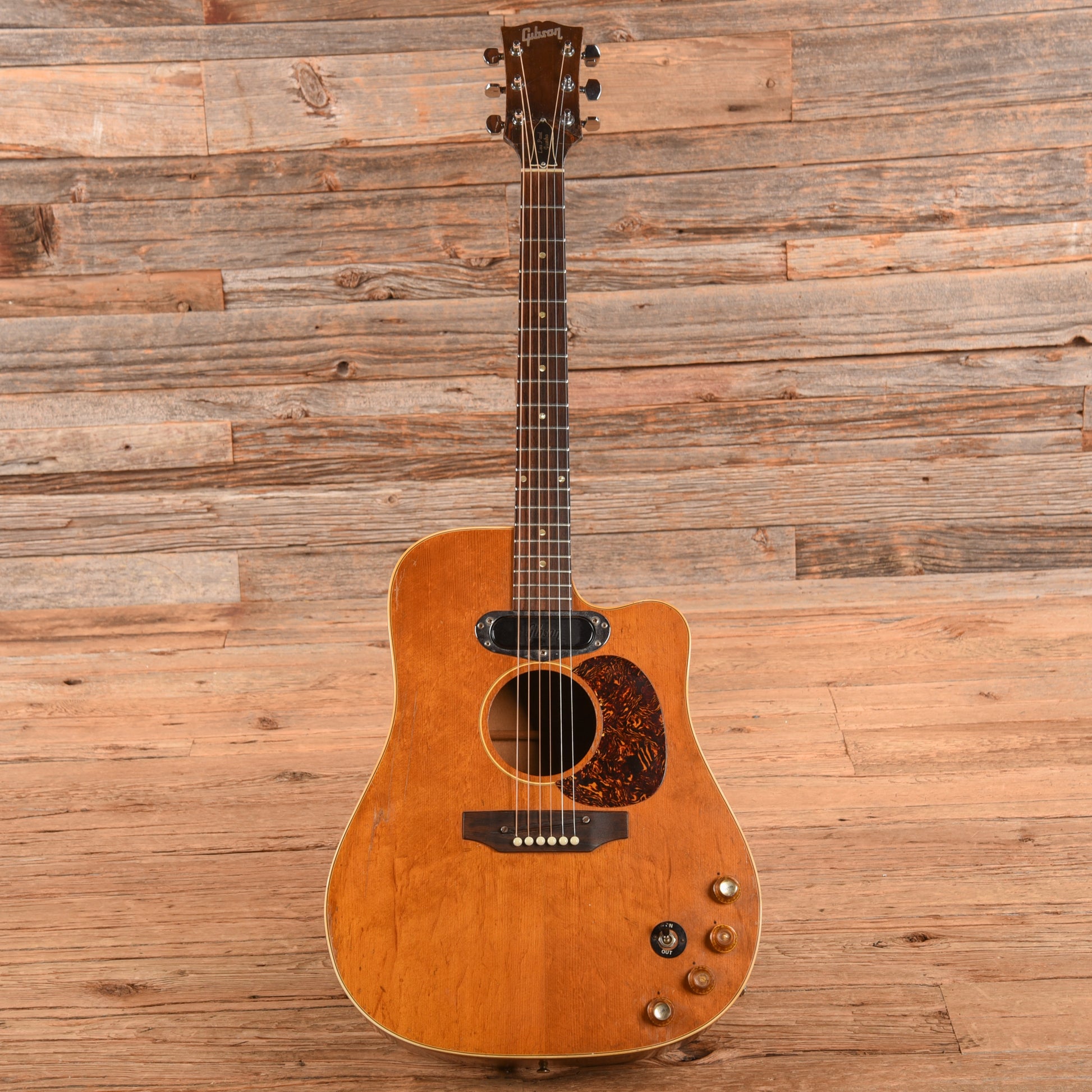 Tech Notes: The guitar plays well with low action; the saddle has limited downward adjustability, but the guitar sets up well. The wide frets are low with light play wear. The serial number dates the guitar to 1969.