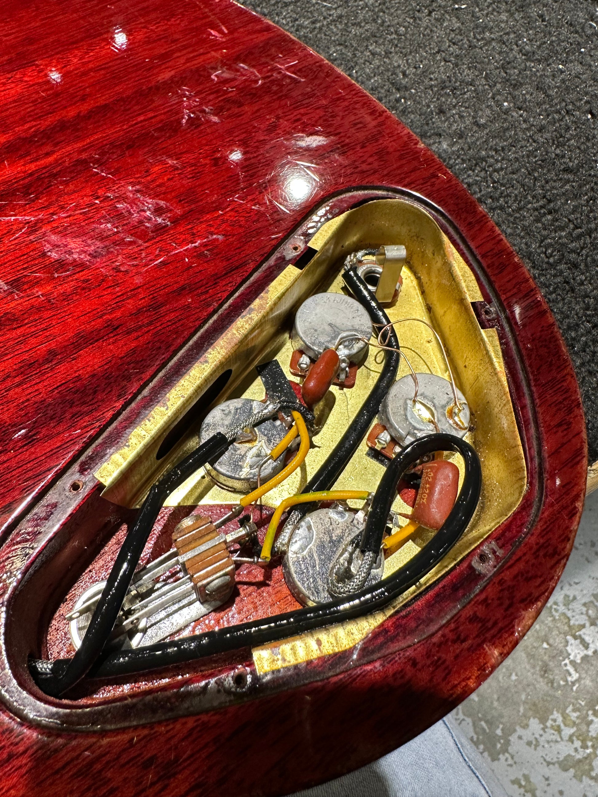 Tech Notes: This SG plays well with medium action. The original frets are wide and show moderate wear. It is being dated to 1970 based on the serial number and visible pot code.