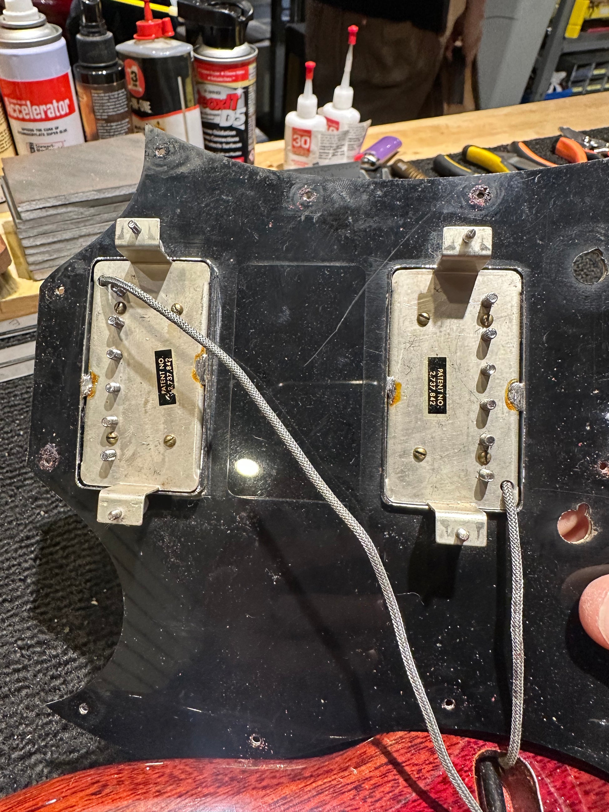 Electronics: Original Gibson "Pat. No." sticker humbuckers with a three-position switch, two volume pots, and two tone pots. All components appear to be original with one visible pot code displaying a 1970 date.