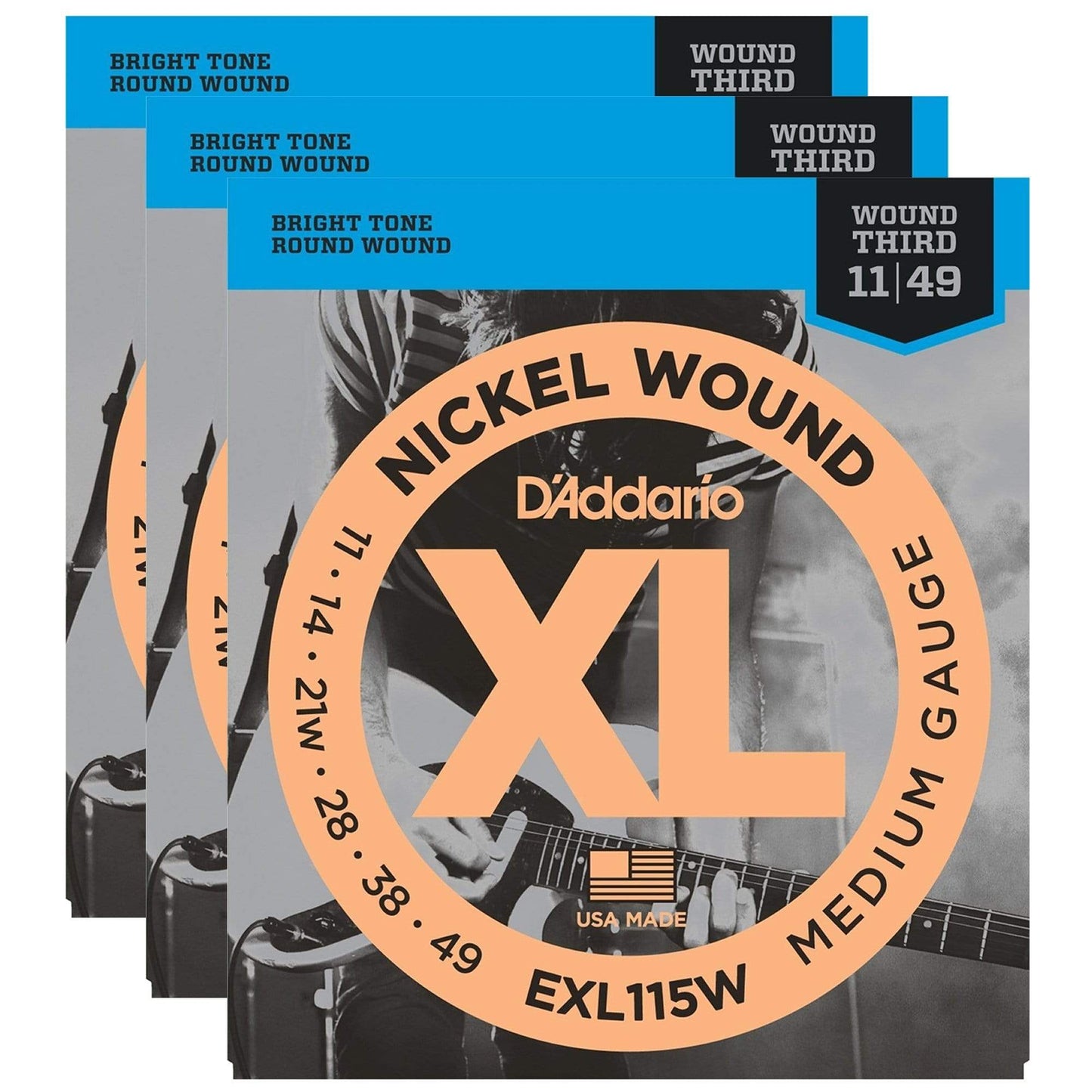 These D'Addario EXL115W Electric 11-49 w/Wound 3rd Strings come in a pack of 3.