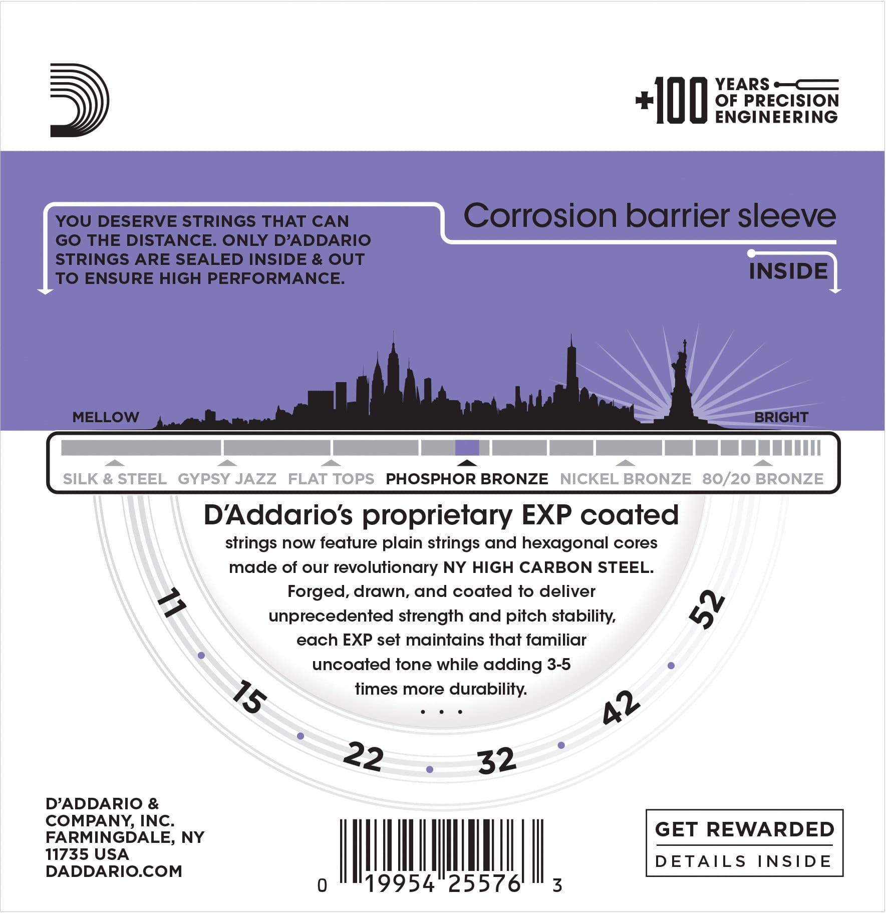 The original phosphor bronze hybrid gauge from D'Addario, this 3-pack of 11-52 Custom Light EXP26-3D acoustic steel strings feature lighter gauge bottom strings for depth and projection and less tension on the high strings for easy bending.Introduced to string-making by D'Addario in 1974, phosphor bronze is one of the most popular choices amongst acoustic players for its balanced tone, and these are a durable, wonderfully sonorous example at an excellent value.