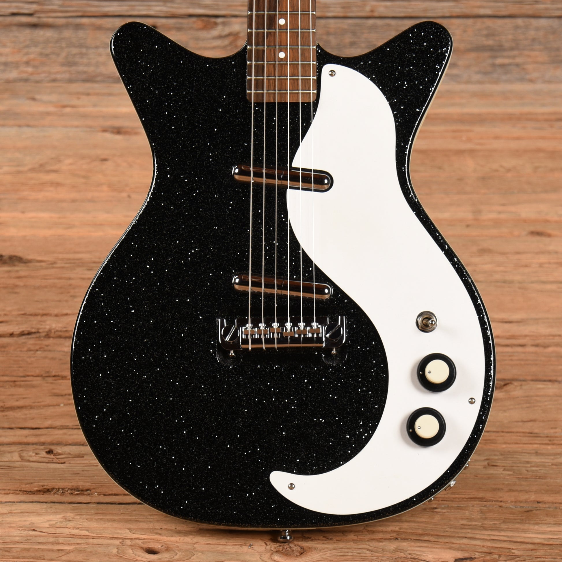 | Tech Notes: | This used Danelectro guitar plays well with low action and optimal neck relief. The frets are wide and tall with minimal play wear. |
