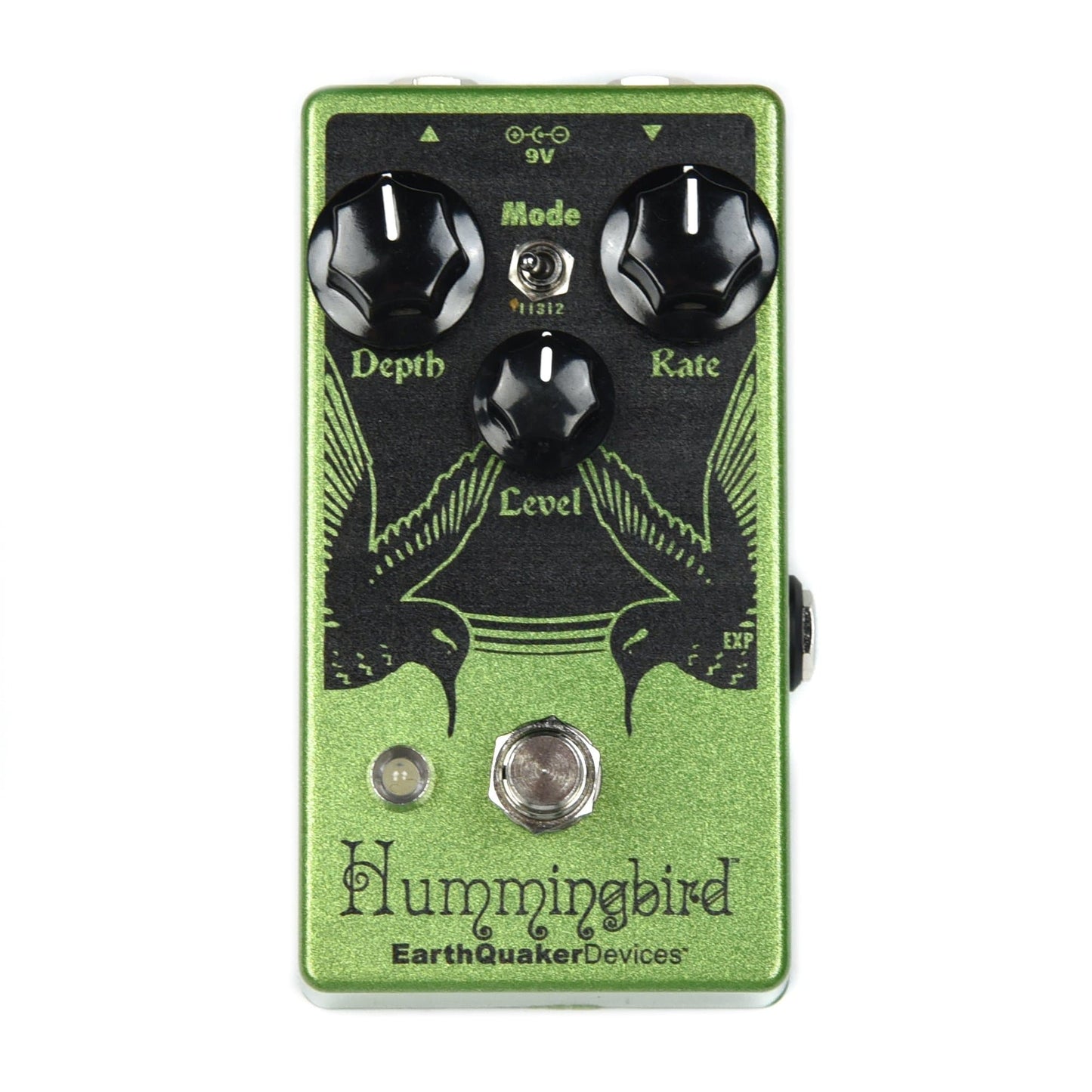 Welcome to your new Hummingbird™ Repeat Percussion tremolo! The Hummingbird is a choppy, sawtooth tremolo modeled on the vintage “repeat percussion” unit and similar to those found in old Valco and Vox amplifiers. It is capable of producing everything from classic “50’s style” shimmering tremolo to a synthy, delay-like chop that turns your signal into a burst of short pings and on through to near ring modulation speeds. Simply choosing between modes 1 (slow), 2 (mid-tempo) or 3 (fast) and adjusting the rate and depth controls will unlock a whole new world of amplitude modulation at your feet. The Rate is also expression pedal accessible to allow instant changes on the fly. Using an expression pedal opens up the possibility of true random amplitude modulation! In addition to the modulation, the Hummingbird has plenty of clean gain on-tap allowing you to either boost or cut the signal using the level control. If the Depth is turned to zero, the Hummingbird will become a JFET clean boost! The Hummingbird is all analog, true bypass and handmade one at a time on a gilded cloud in Akron, Ohio.