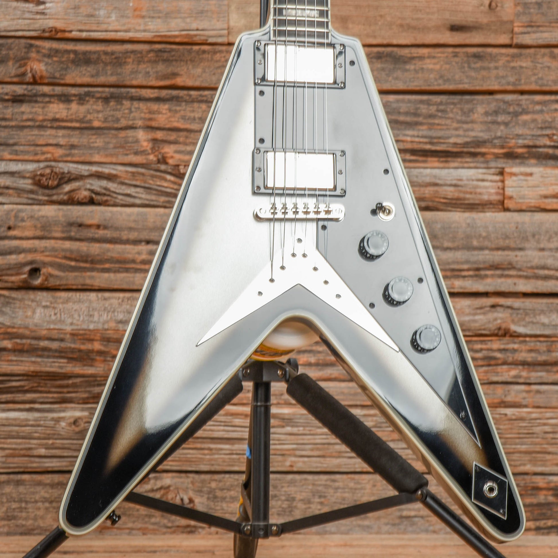 | Tech Notes: | This Flying V plays well with low action. The frets are tall and show light wear. |