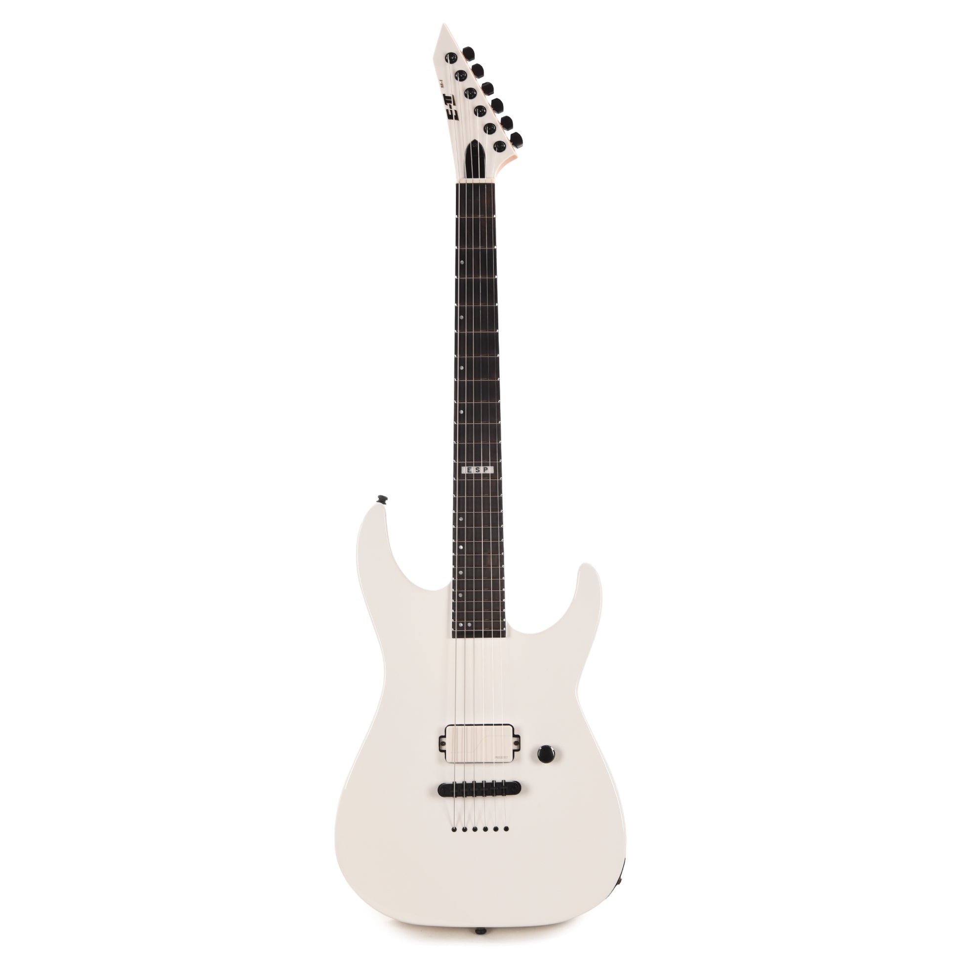 Formerly known as “ESP Standard”, ESP E-II instruments are made in Japan at the ESP factory. With one premier-quality pickup and one master volume knob, nothing gets in the way of your most intense performances using the E-II M-I Thru NT. You will stand out in a crowd with its gleaming gloss Snow White finish. It features neck-thru-body construction at 25.5” scale for extreme stability and sustain, as well as unencumbered access to its 24 extra jumbo stainless steel frets. This guitar offers a comfortable alder body with a three-piece maple neck that features a natural satin-finished back for extreme speed and fluidity. In addition to its stainless steel frets, the ebony fingerboard features offset mother-of-pearl dot inlays. Built for speed, components on the E-II M-II Snow White include Gotoh locking tuners, a Gotoh TOM bridge with string-thru-body, and a bone nut. A Fishman Fluence Modern Humbucker active pickup with matching white cover provides all the tone you need, and you can switch to a second pickup voice using a push-pull volume control. Includes ESP deluxe hardshell case.