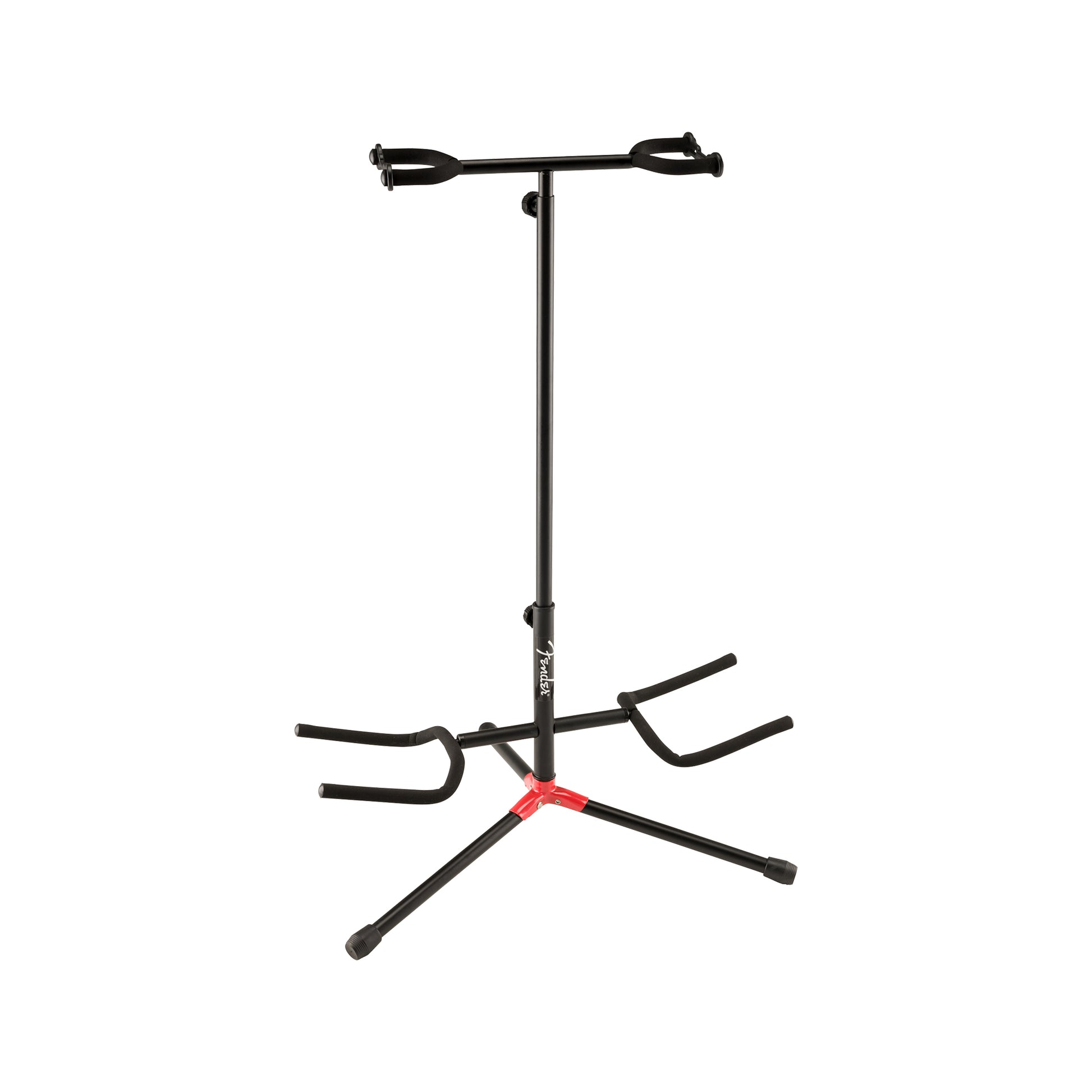 Fender's Adjustable Cradle Guitar Stand conveniently showcases your acoustic, electric or bass guitar. The height-adjustable neck yoke comfortably accepts various instrument sizes while the lower support swivels to accommodate standard and offset body styles. This stand’s metal construction is durable enough for road use, and padded yokes offer security while in use. Perfect for the musician on the go, this stand is easily collapsible for convenient transport.