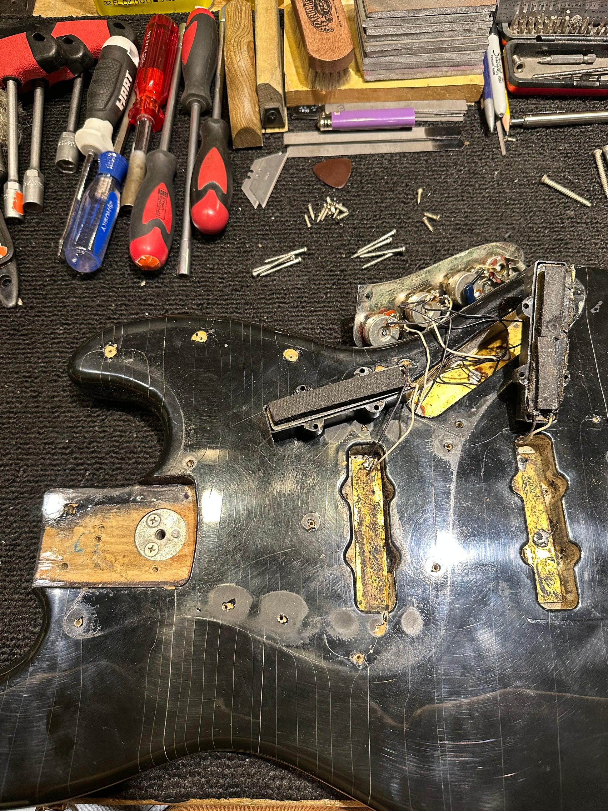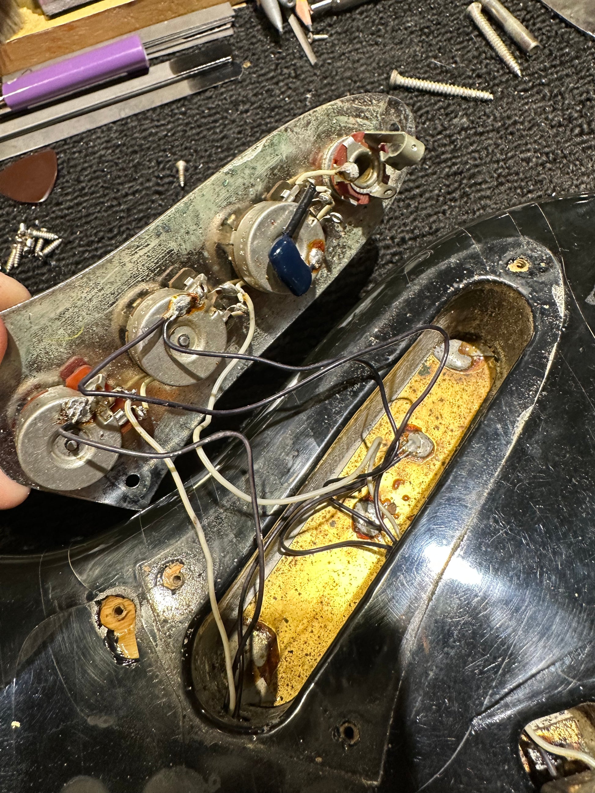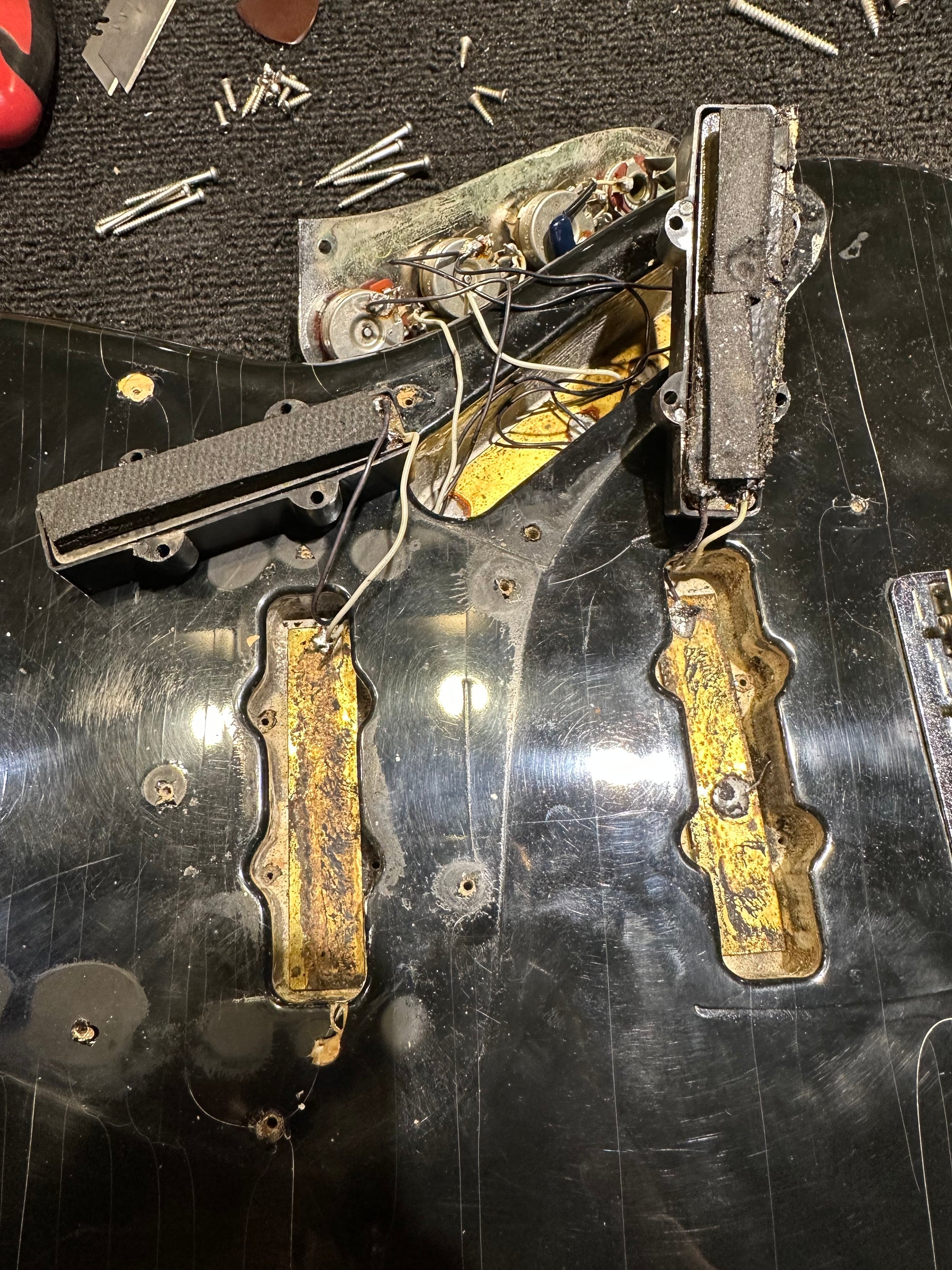 | Electronics: | Original Fender pickups with two volume pots and a master tone pot. All electronics are original with the pots displaying 1977 dates. |