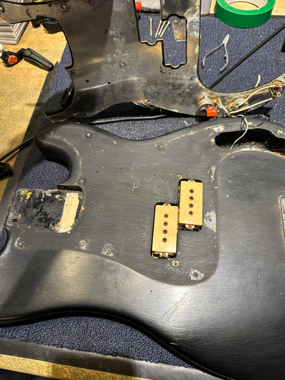 | Finish Details: | Non-original black refinish on the body. The finish does not have a clear coat and has sanding marks throughout. The finish on the neck appears to have been over-sprayed. |