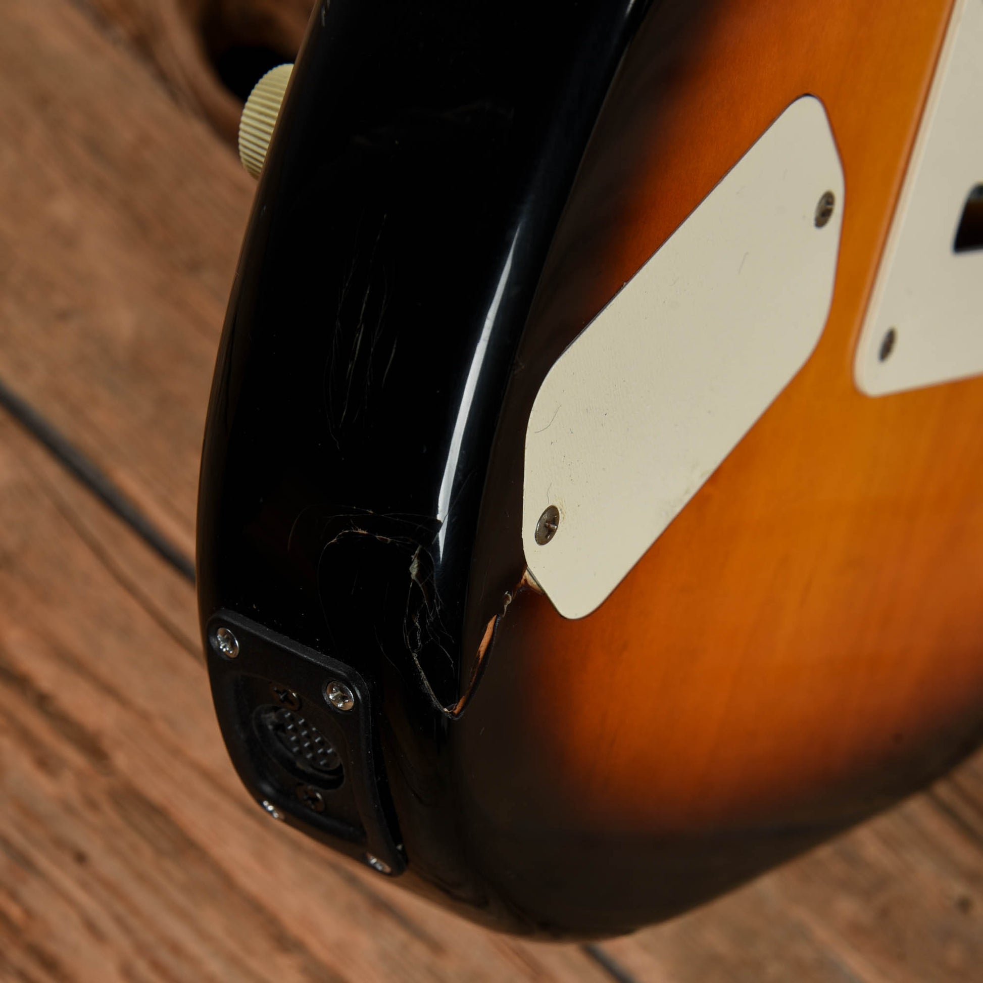 | Cosmetic Condition: | This used Fender guitar is in good cosmetic condition with various play wear, finish checking and minor dings. The lower bout near the Roland jack has a large ding where some flakes of finish have chipped off. |