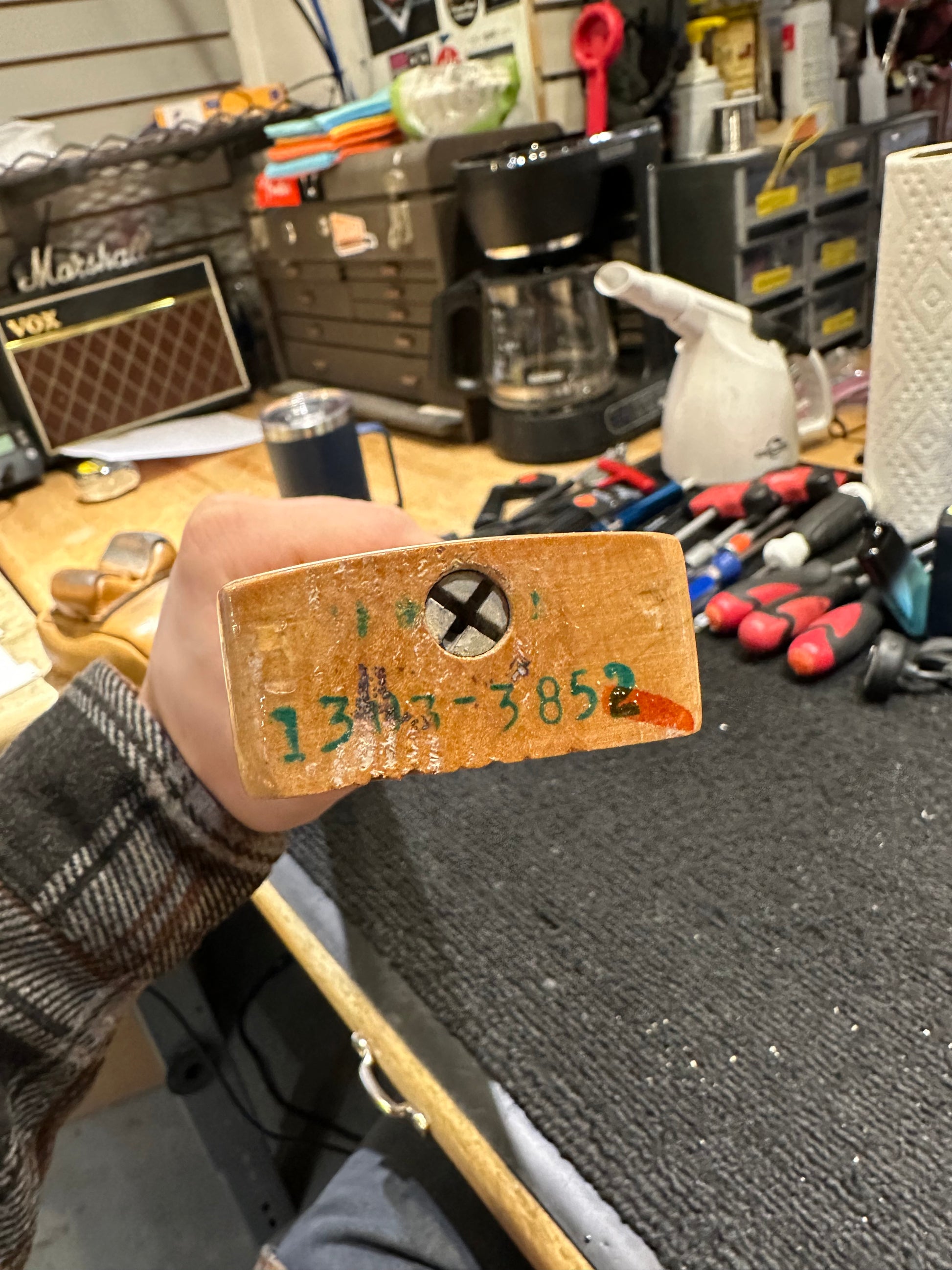 | Electronics: | Non-original Fralin pickups with a three-position switch, a master volume pot, and a master tone pot. The volume pot is not original. The tone pot is original and show 1974 pot codes. |