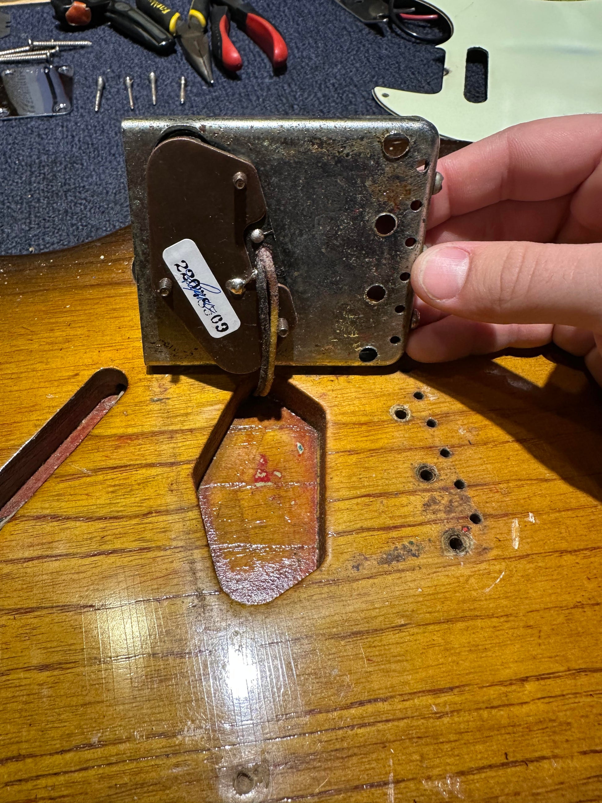 | Hardware: | The bridge, saddles, electronics cavity plate, and knobs are original. The tuner holes in the headstock were reamed out to accompany aftermarket tuners. These have since been removed and Kluson Deluxe tuners of the era have been installed. The nut, string tree, pickguard, and switch tip are not original. |