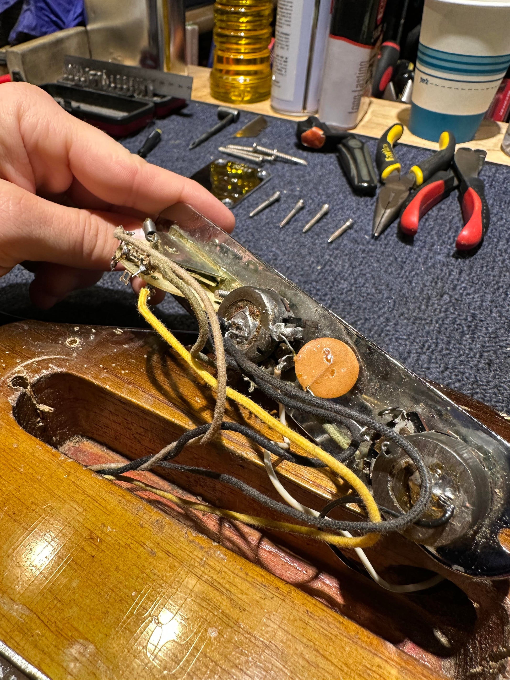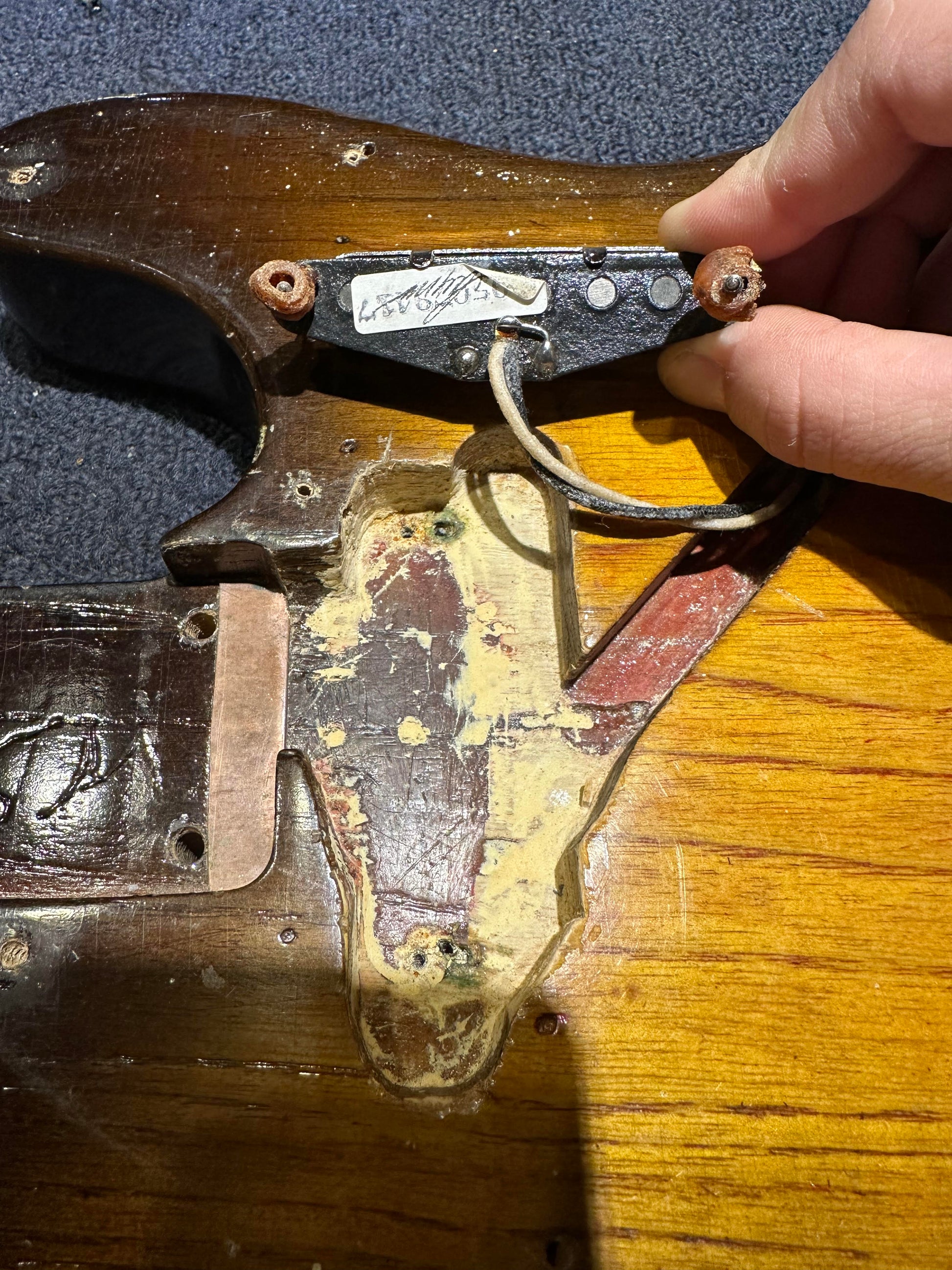 | Electronics: | Non-original Seymour Duncan Antiquity pickups with a three-position switch, a master volume pot, and a master tone pot. The switch is not original as well as some wiring and solder joints. The pots have had the bottoms sanded and because of this, the pot codes were worn away and are unable to be authenticated. Although the codes have been sanded off, the pots appear to be era correct but, again, cannot be deemed original. |