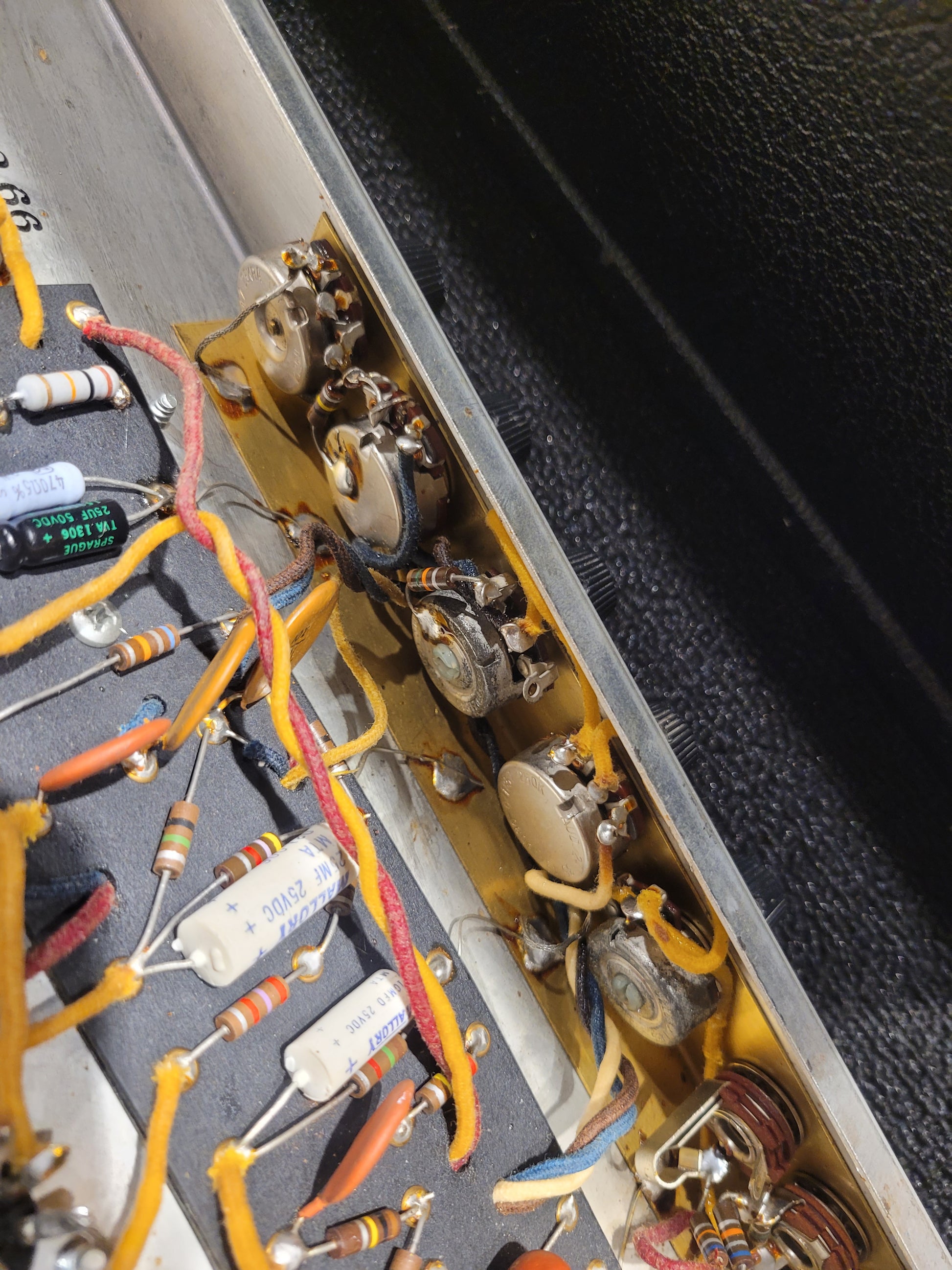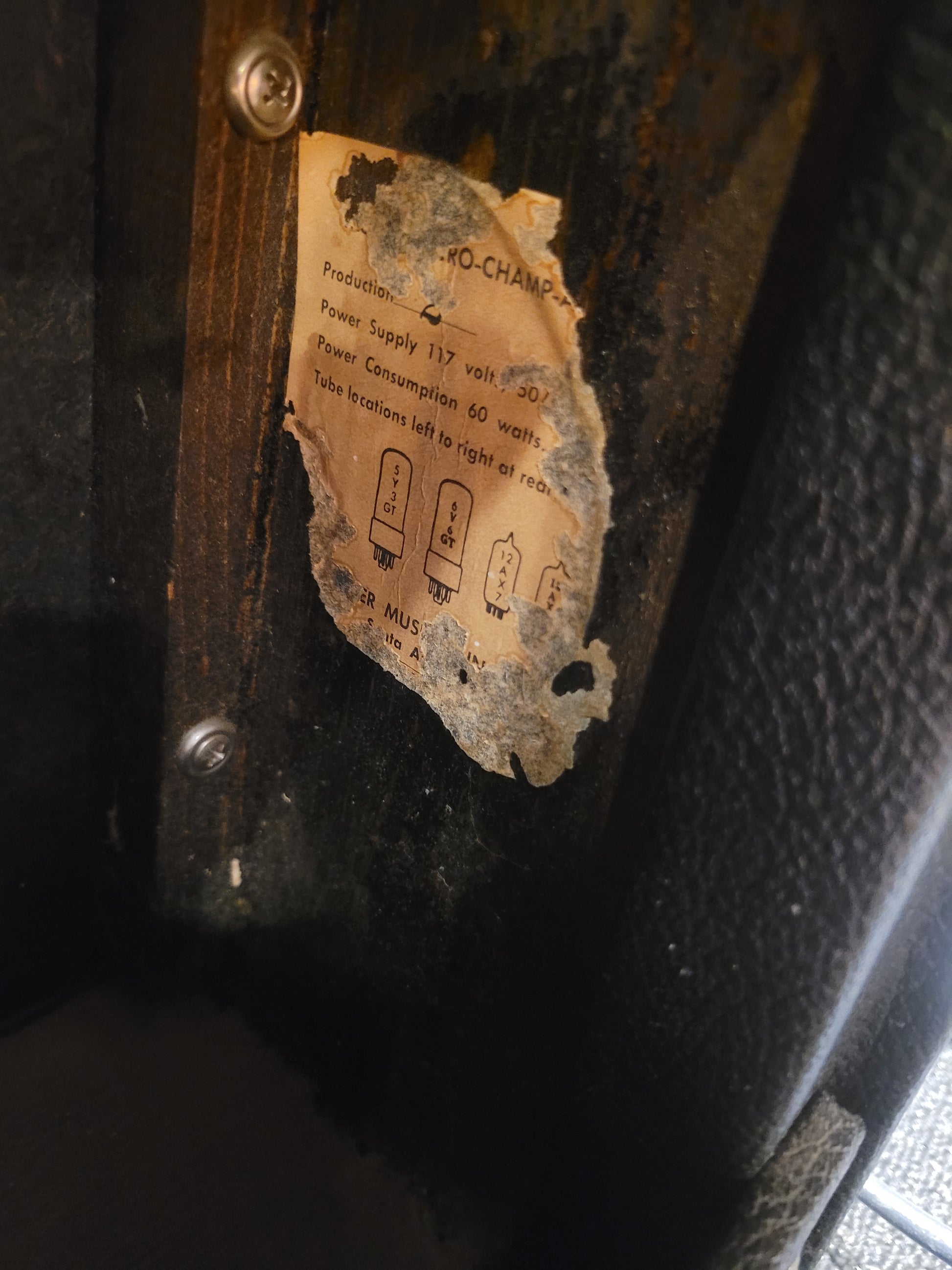 Amp Condition: The amp is in good condition for its age. The tube chart inside the amp is mostly worn away. The upper back panel is missing.