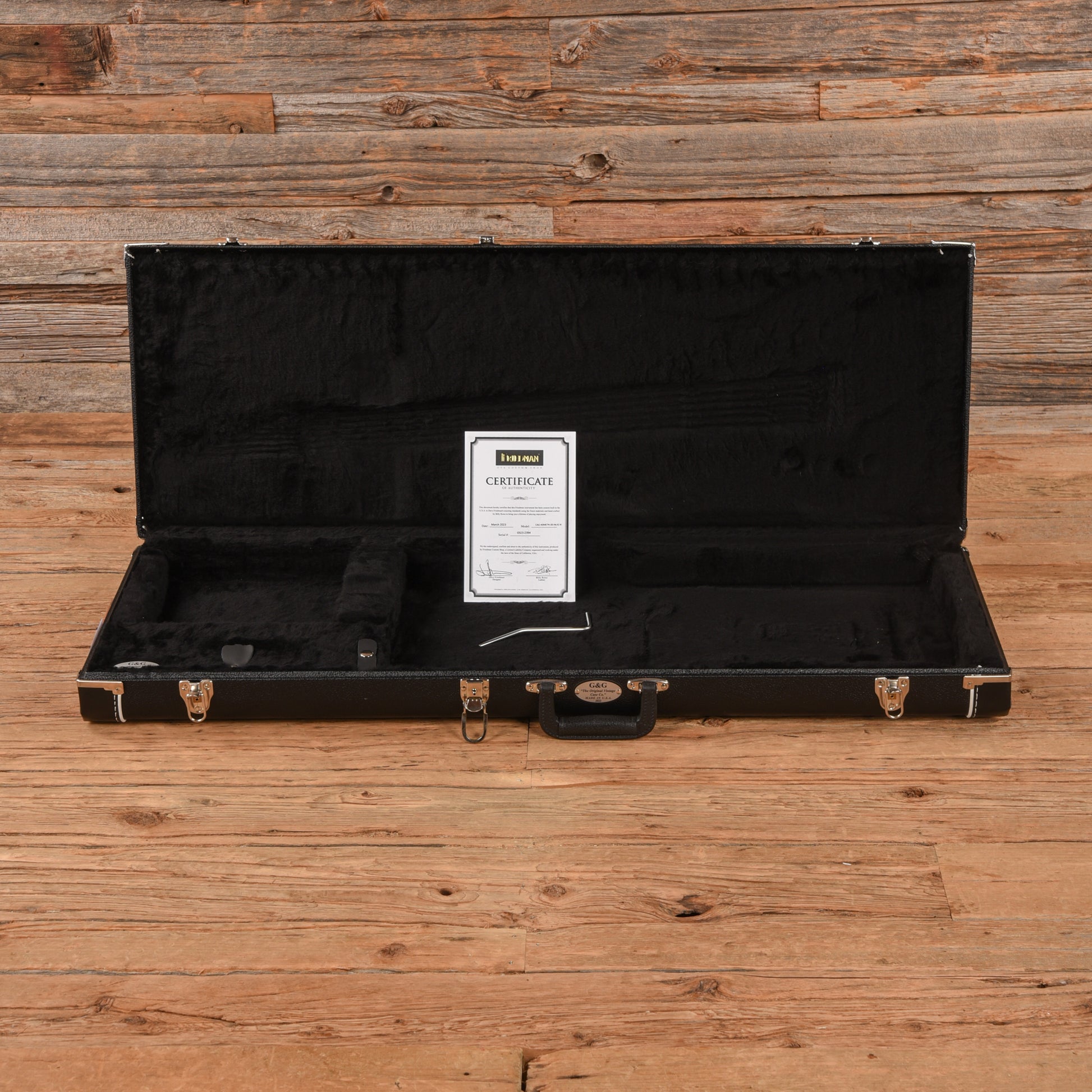 | Tech Notes: | This Cali plays well with low action. The frets are tall and show light wear. |