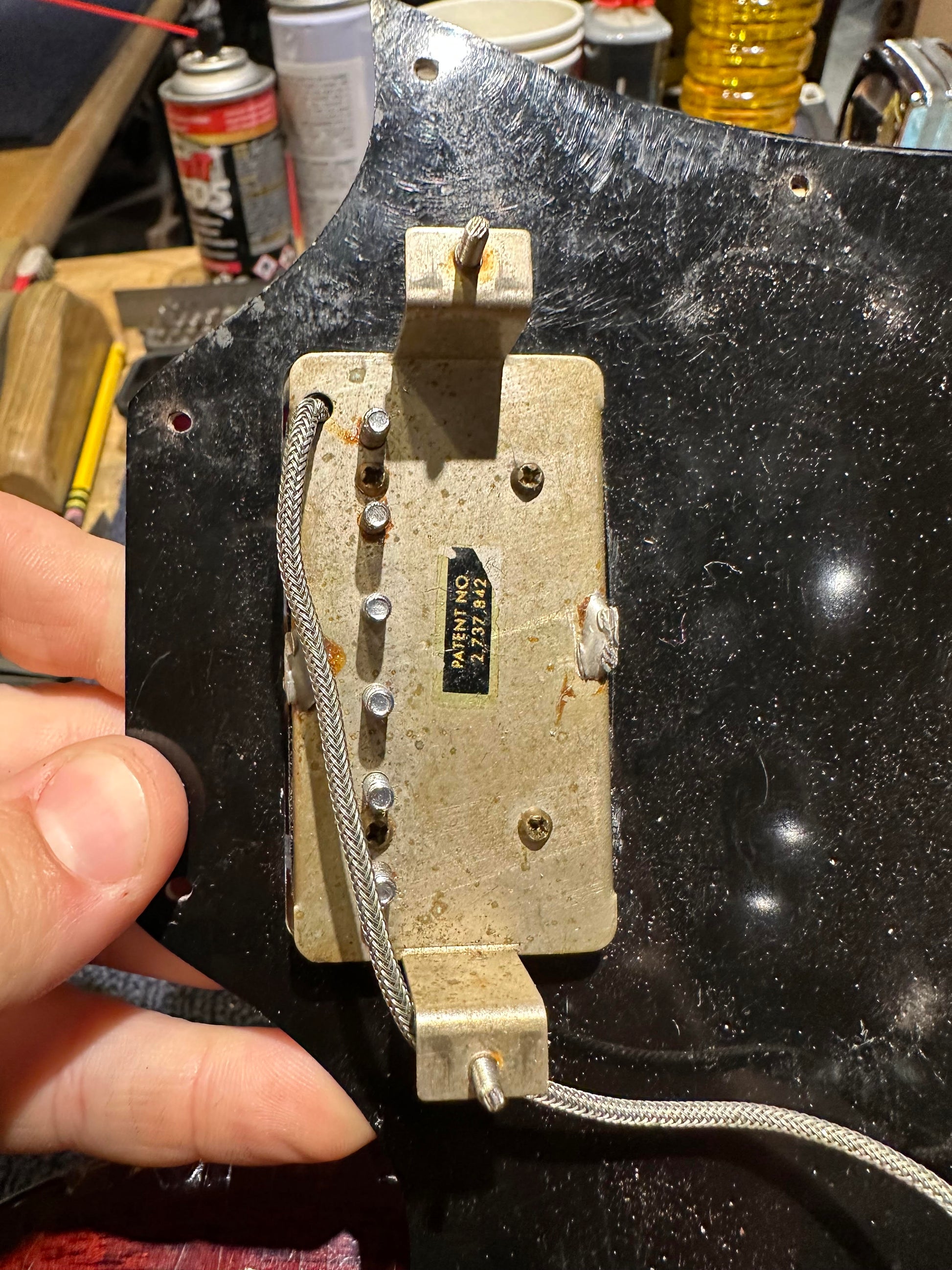 | Electronics: | The neck pickup is an original Gibson "Pat. No." sticker humbucker and the bridge pickup is a non-original Gibson T-Top humbucker. The jack, wiring, pots, and switch appear to be original. The pots display 1965 dates. |