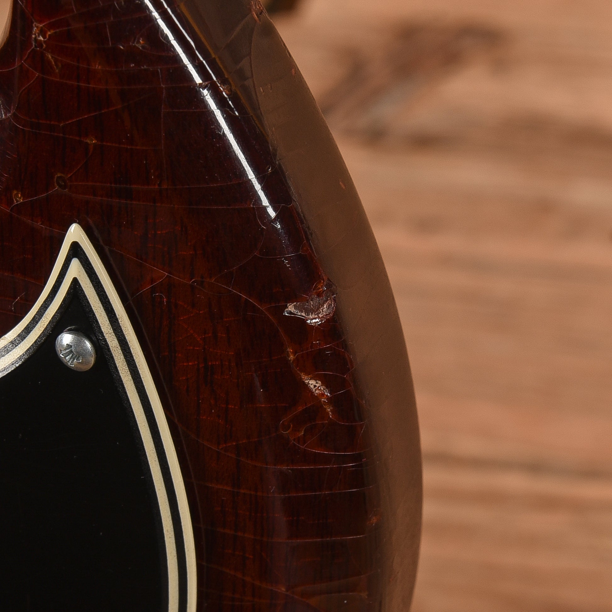 | Cosmetic Condition: | This vintage SG is in good cosmetic condition with heavy play wear throughout. There are dings, dents, scratches, and tape marks throughout. The checking is apparent throughout but especially around the pots and the surrounding areas. |