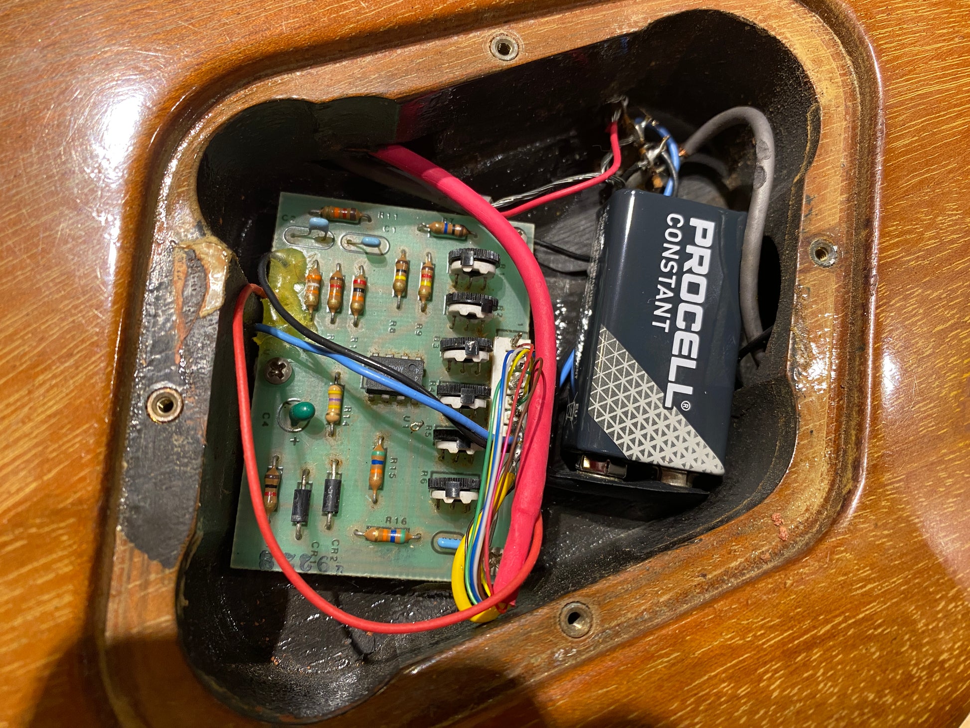 | Electronics: | Original electronics. The guitar has a piezo pickup with a volume wheel and a tone wheel. |