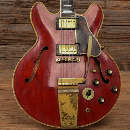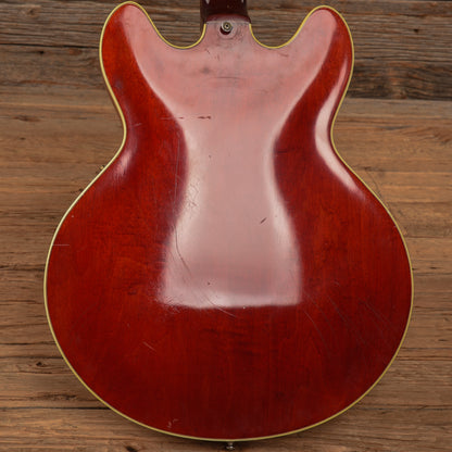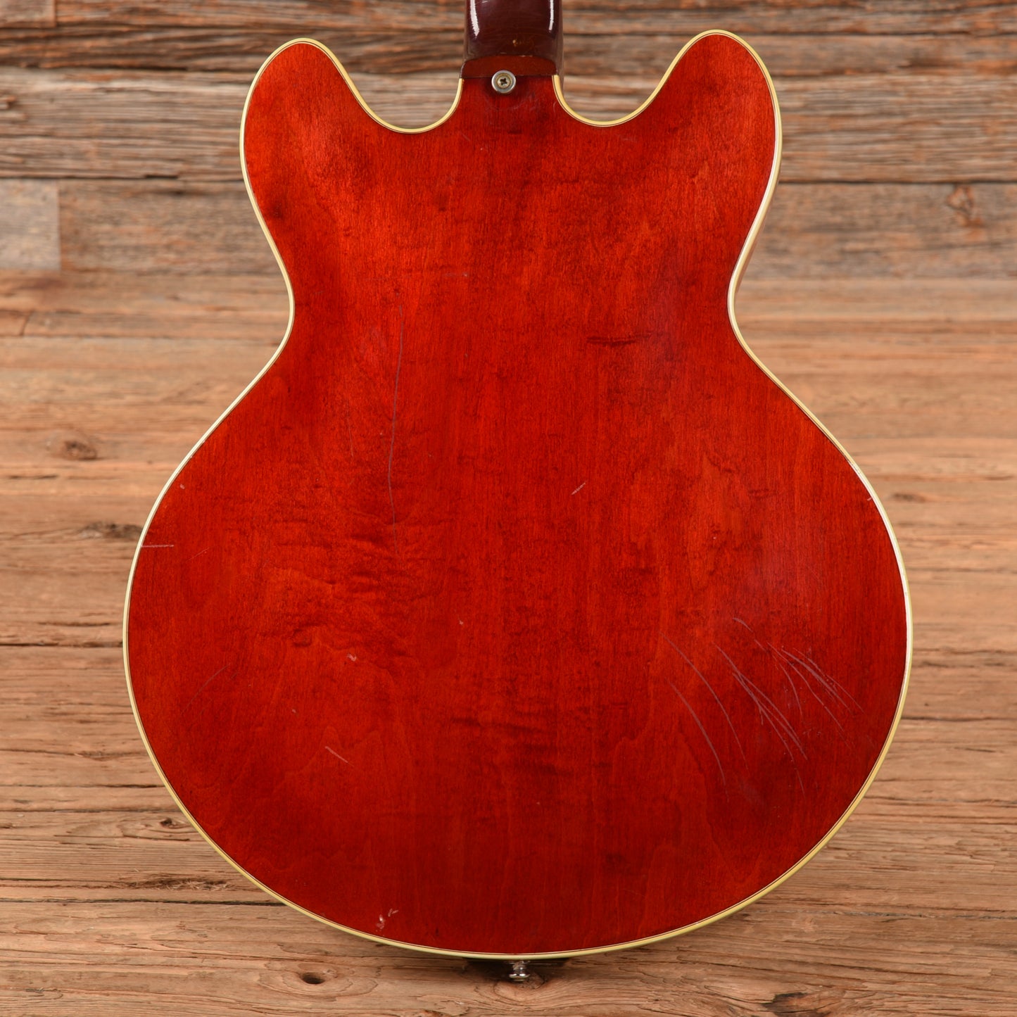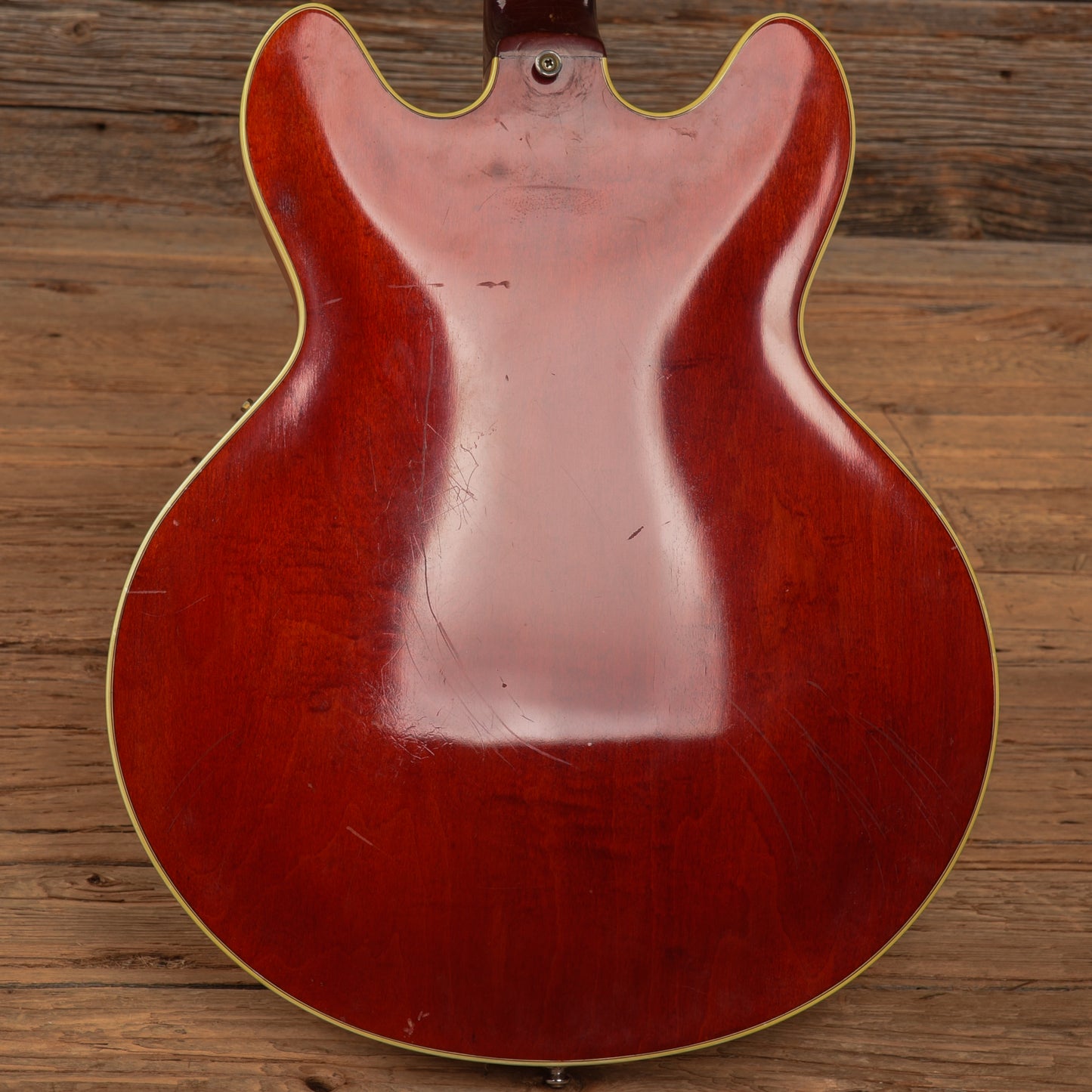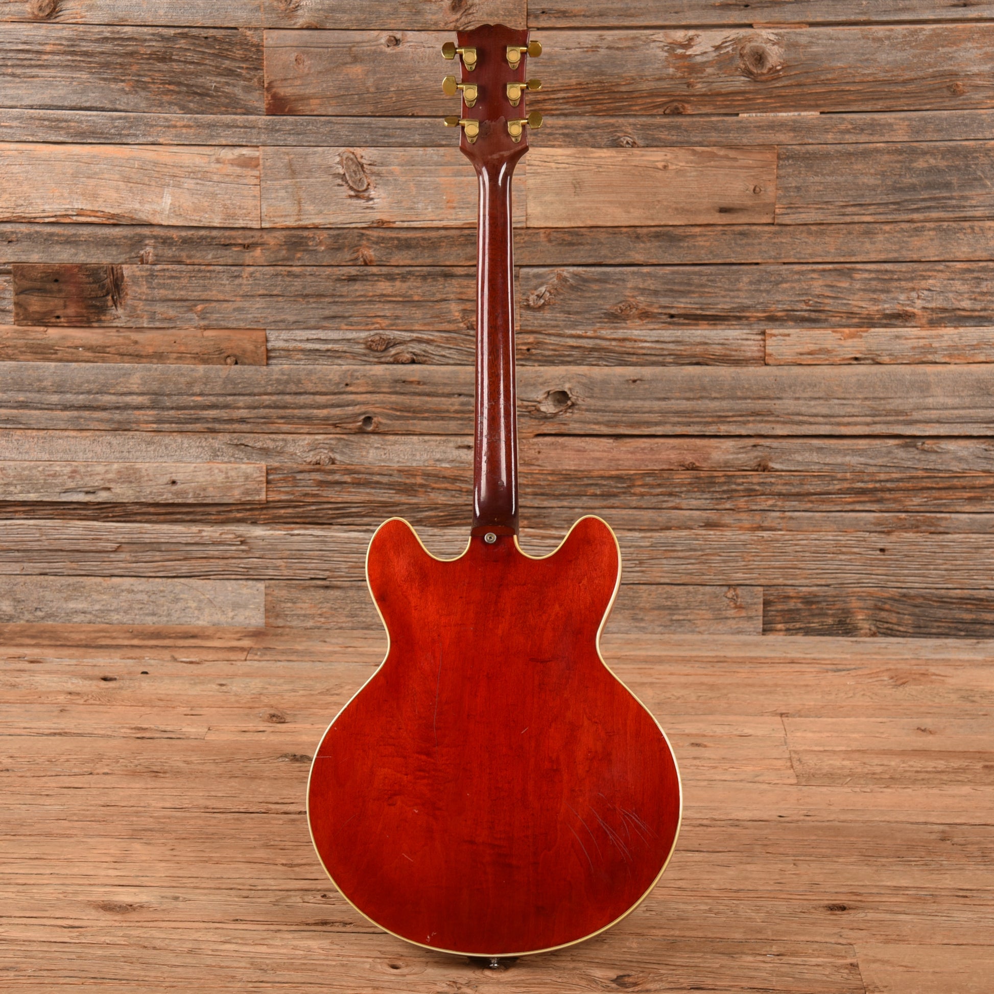 | Cosmetic Condition: | This vintage ES-355 is in good cosmetic condition with tasteful checking throughout the neck and top of the body. There are small chips in the finish along the back of the neck as well as minor dings, dents, and scratches throughout the entirety of the body; and heavy tarnishing on the hardware. |