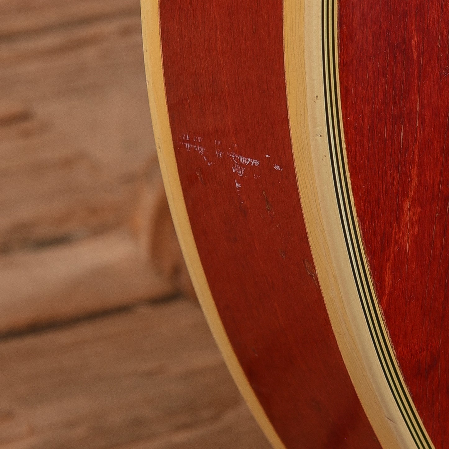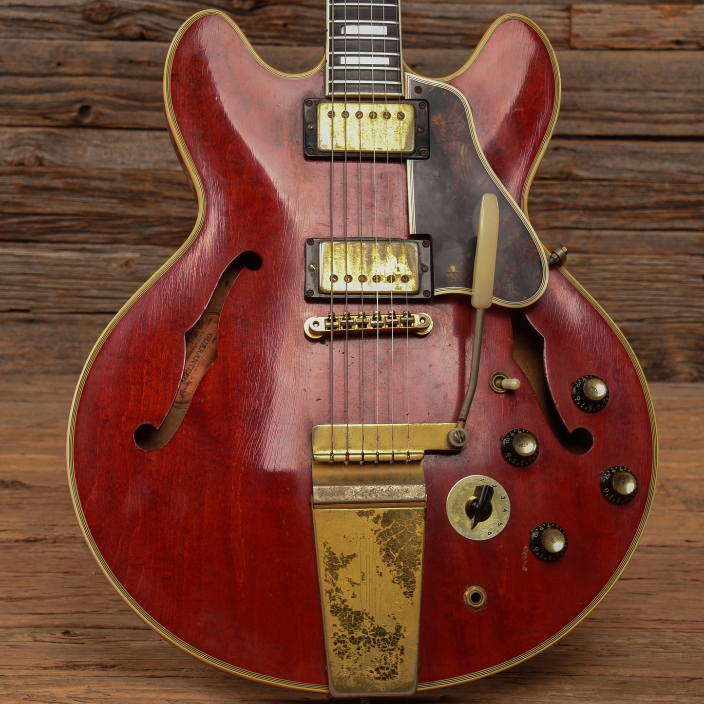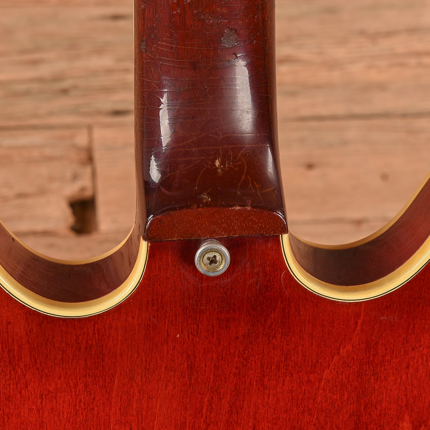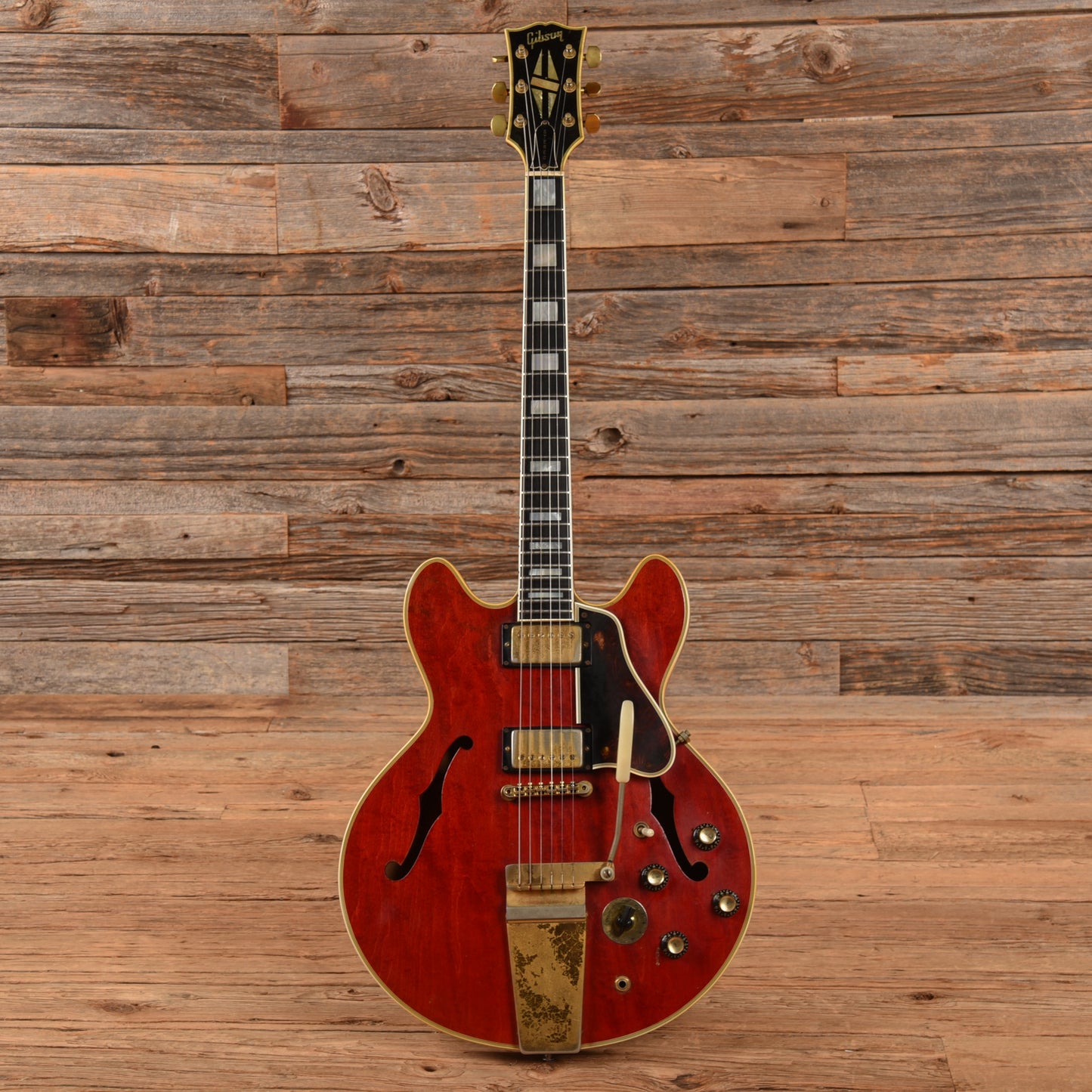 | Cosmetic Condition: | This vintage ES-355 is in good cosmetic condition with tasteful checking throughout the neck and top of the body. There are small chips in the finish along the back of the neck as well as minor dings, dents, and scratches throughout the entirety of the body; and heavy tarnishing on the hardware. |