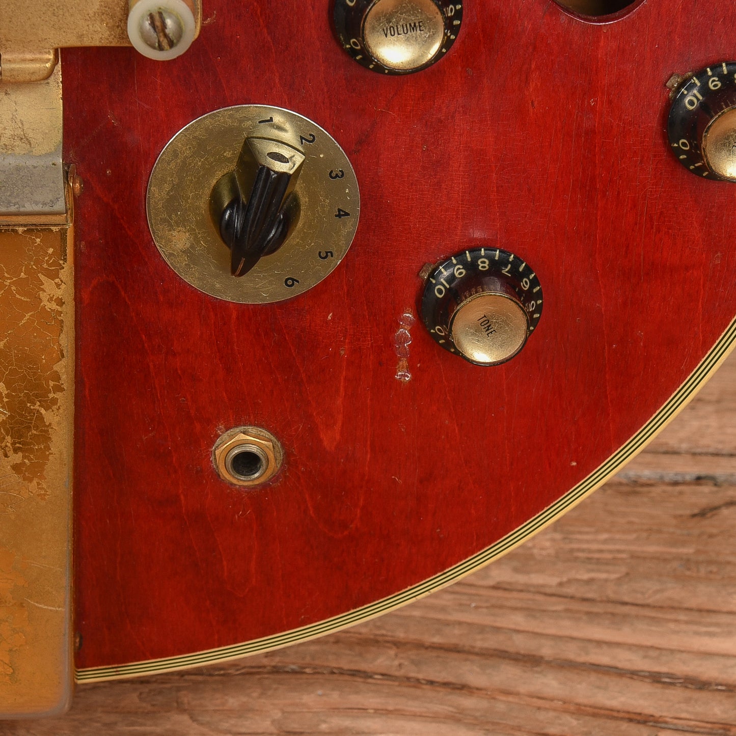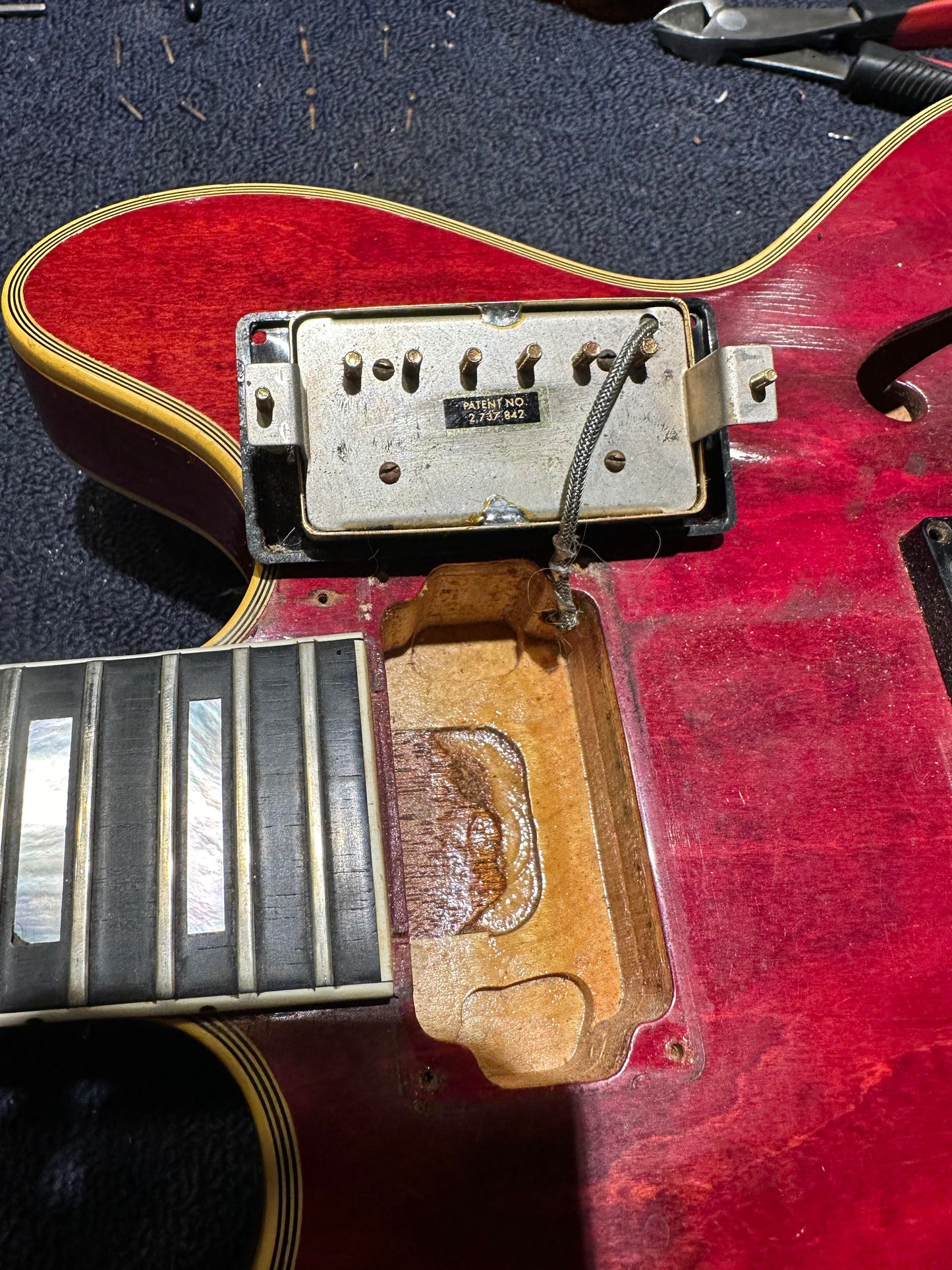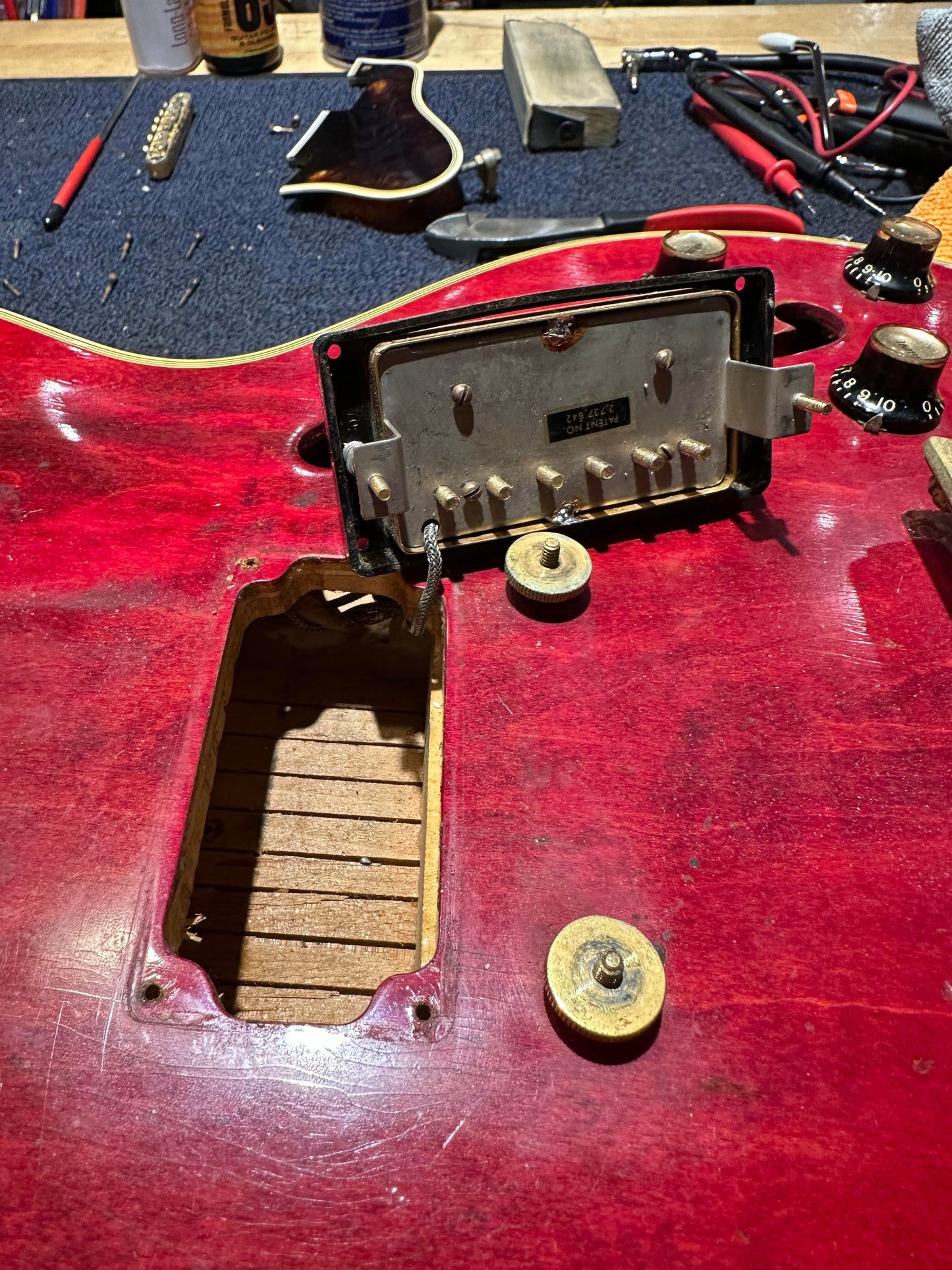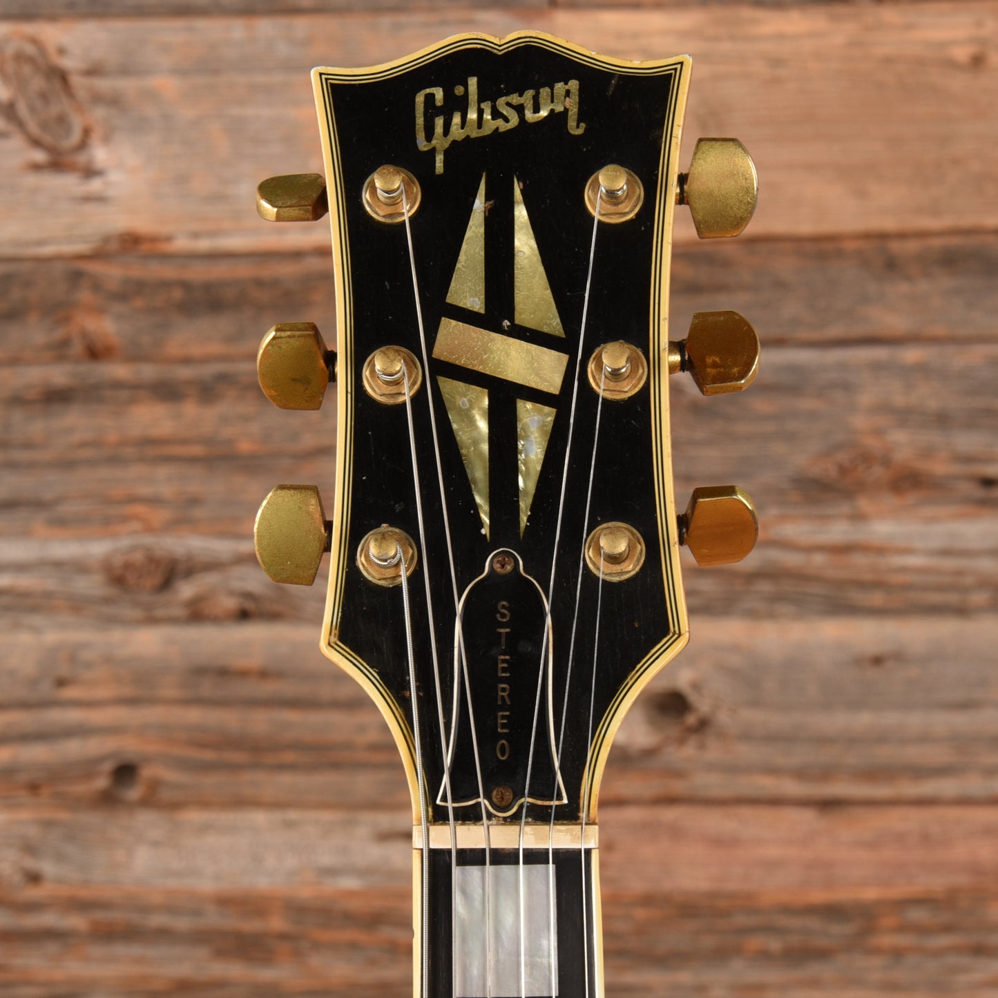 | Electronics: | Original Gibson "Pat. No." humbuckers with a three-position switch, two volume pots, and two tone pots. The pots and wiring are not original. In conjunction with the mono re-wire, the Vari-tone rotary switch has been removed and a standard potentiometer was been installed in it's place. It is not wired into the harness and is purely cosmetic. |
