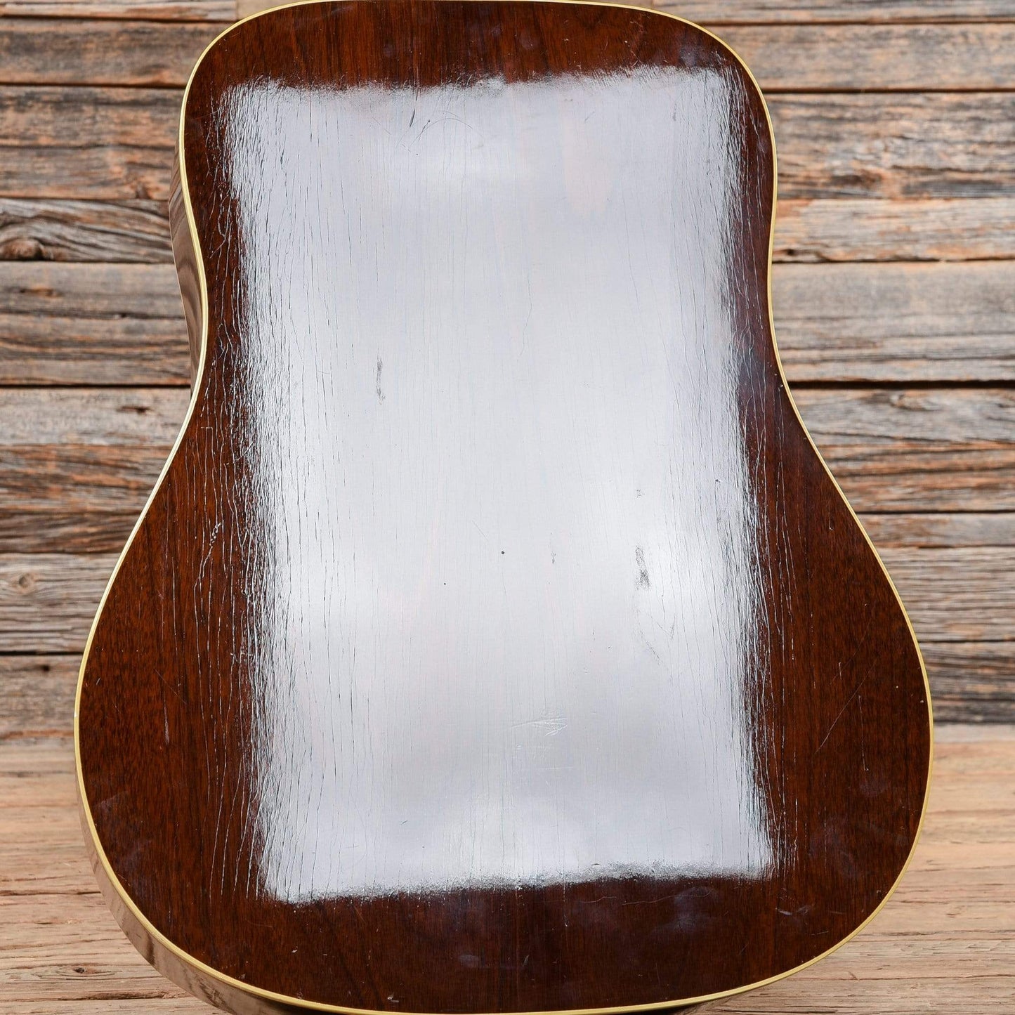 | Cosmetic Condition: | The guitar has moderate play wear. The finish is glossy with checking and dents and scratches throughout. There is pick wear on the top and light buckle rash on the back. There is a hairline crack running through the bridge in line with the bridge pins. This is not affecting playability. |