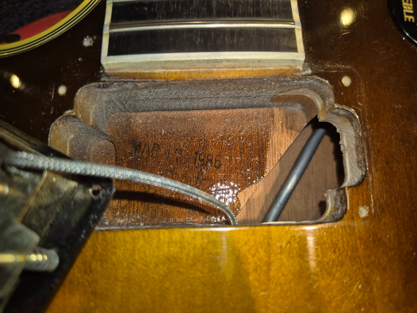 | Tech Notes: | The guitar plays well with low action and optimal neck relief. The frets are wide and medium height with minor play wear. The neck pickup cavity is stamped with a 1986 date and the serial number also dates to 1986. |